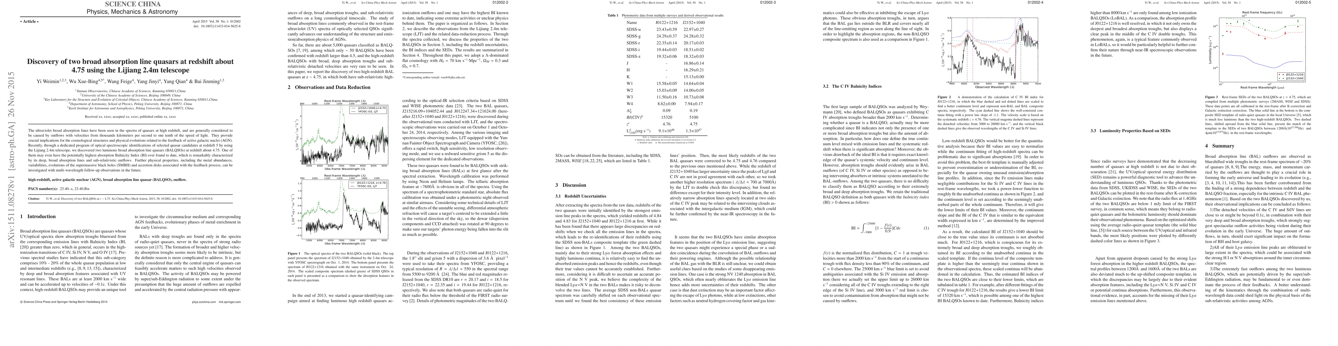 Researchers discovered two broad absorption line quasars (BALQSOs) at redshift ~4.75 using the Lijiang 2.4m telescope, revealing deep, broad absorption lines indicative of sub-relativistic outflows. These findings provide insights into the feedback mechanisms of active galactic nuclei and their cosmological implications.