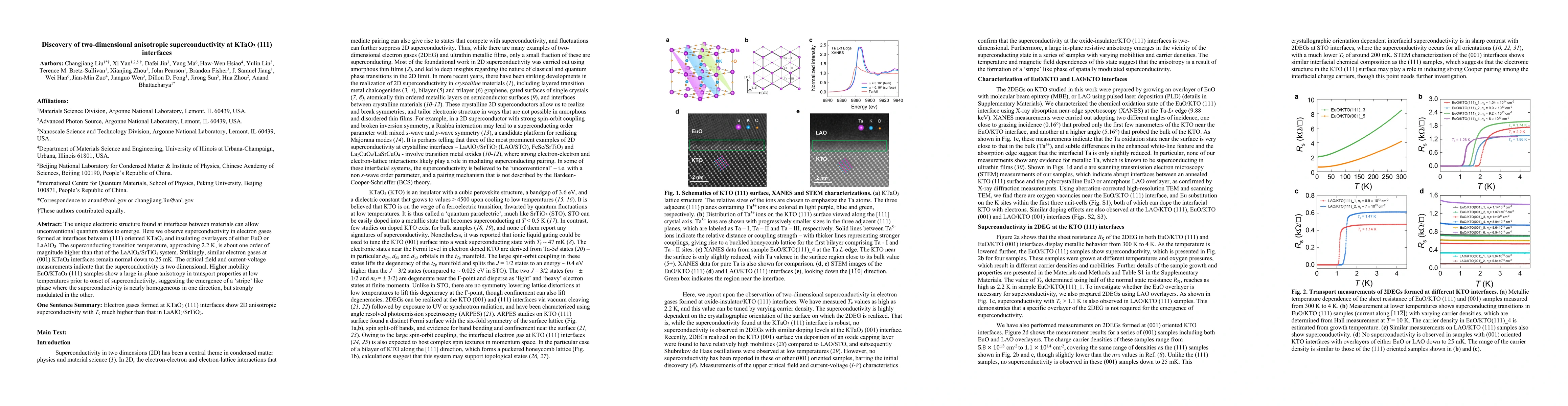 This paper reports the discovery of two-dimensional anisotropic superconductivity at (111) interfaces between KTaO$_3$ and insulating overlayers of EuO or LaAlO$_3$, with a transition temperature of 2.2 K. The superconductivity is notably anisotropic, with significant differences in transport properties in different directions.