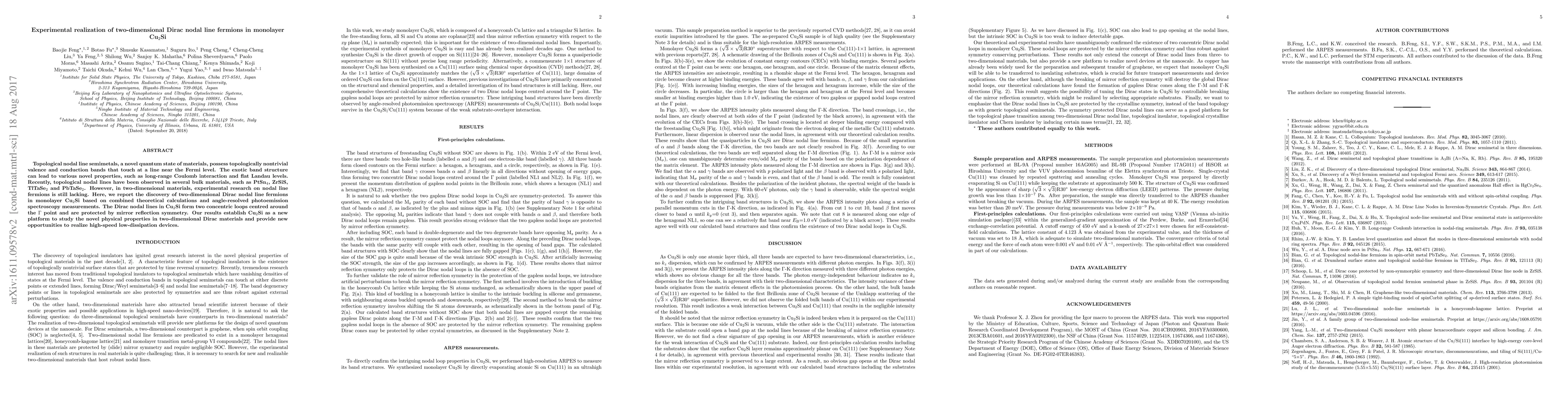Researchers discovered two-dimensional Dirac nodal line fermions in monolayer Cu2Si, confirmed by theoretical calculations and experimental measurements. This finding highlights Cu2Si as a novel platform for studying unique physical properties in two-dimensional materials, potentially enabling advanced, low-dissipation devices.