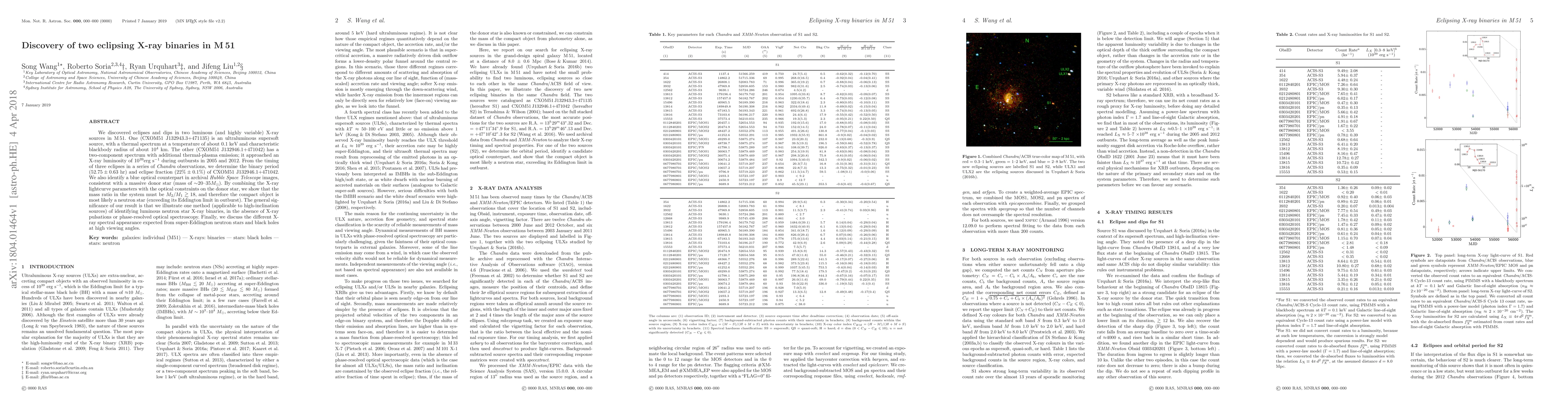 We discovered eclipses and dips in two luminous (and highly variable) X-ray sources in M\,51. One (CXOM51 J132943.3$+$471135) is an ultraluminous supersoft source, with a thermal spectrum at a temperature of about 0.1 keV and characteristic blackbody radius of about $10^4$ km. The other (CXOM51 J132946.1$+$471042) has a two-component spectrum with additional thermal-plasma emission; it approached an X-ray luminosity of $10^{39}$erg s$^{-1}$ during outbursts in 2005 and 2012. From the timing of three eclipses in a series of {\it Chandra} observations, we determine the binary period ($52.75 \pm 0.63$ hr) and eclipse fraction ($22\% \pm 0.1\%$) of CXOM51 J132946.1$+$471042. We also identify a blue optical counterpart in archival {\it Hubble Space Telescope} images, consistent with a massive donor star (mass of $\sim$20--35 $M_{\odot}$). By combining the X-ray lightcurve parameters with the optical constraints on the donor star, we show that the mass ratio in the system must be $M_2/M_1 \gtrsim ~18$, and therefore the compact object is most likely a neutron star (exceeding its Eddington limit in outburst). The general significance of our result is that we illustrate one method (applicable to high-inclination sources) of identifying luminous neutron star X-ray binaries, in the absence of X-ray pulsations or phase-resolved optical spectroscopy. Finally, we discuss the different X-ray spectral appearance expected from super-Eddington neutron stars and black holes at high viewing angles.