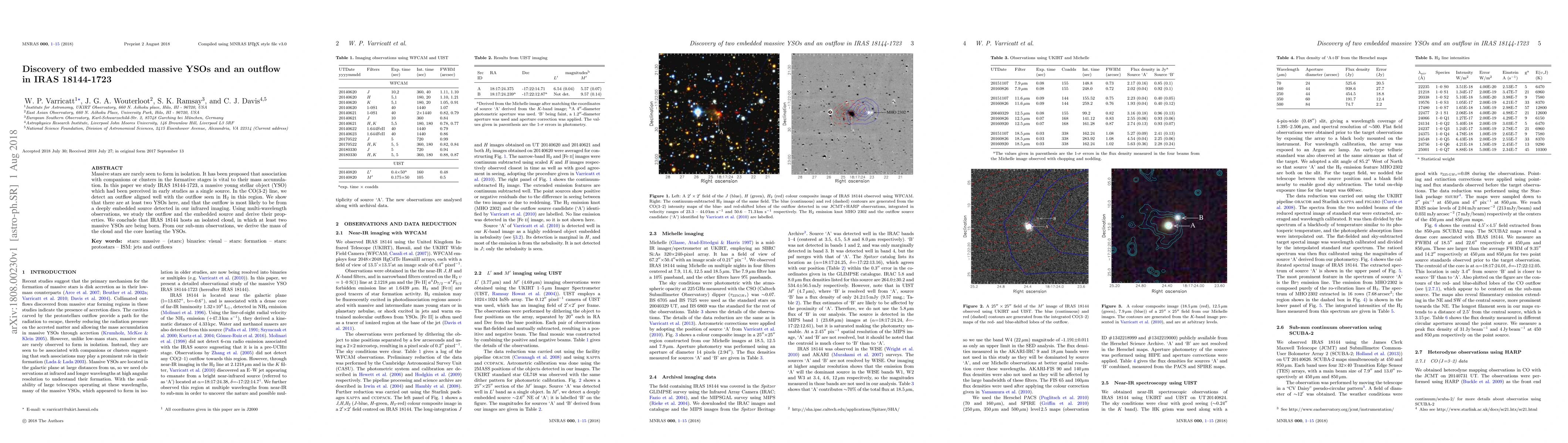 This paper identifies two embedded massive young stellar objects (YSOs) and an outflow in IRAS 18144-1723, challenging previous assumptions of a single YSO. Multi-wavelength observations reveal the outflow's properties and confirm the presence of at least two YSOs in an isolated cloud.