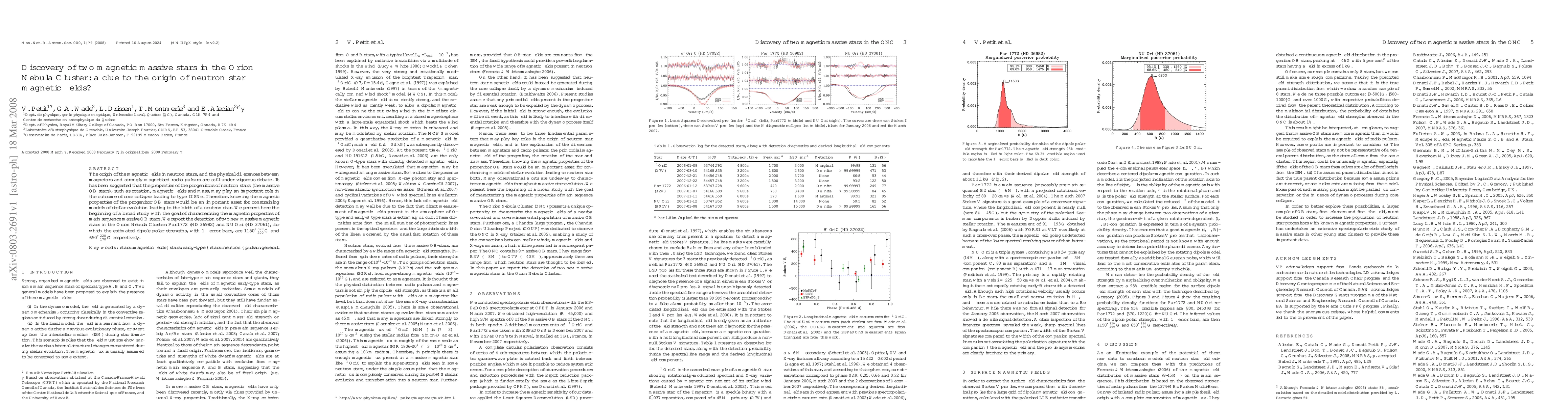 The origin of the magnetic fields in neutron stars, and the physical differences between magnetars and strongly magnetised radio pulsars are still under vigorous debate. It has been suggested that the properties of the progenitors of neutron stars (the massive OB stars), such as rotation, magnetic fields and mass, may play an important role in the outcome of core collapse leading to type II SNe. Therefore, knowing the magnetic properties of the progenitor OB stars would be an important asset for constraining models of stellar evolution leading to the birth of a neutron star. We present here the beginning of a broad study with the goal of characterising the magnetic properties of main sequence massive OB stars. We report the detection of two new massive magnetic stars in the Orion Nebula Cluster: Par 1772 (HD 36982) and NU Ori (HD 37061), for which the estimated dipole polar strengths, with 1 sigma error bars, are 1150 (+320,-200) G and 650 (+220,-170) G respectively.
