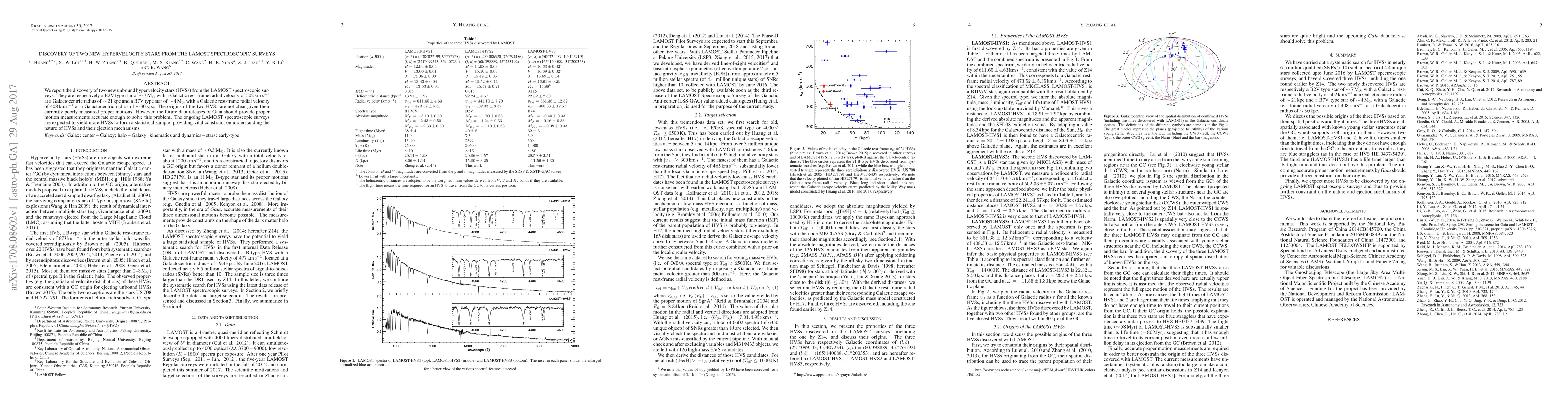 Two new hypervelocity stars (HVSs) were discovered using LAMOST spectroscopic surveys: a B2V star (~7 M$_{\rm \odot}$, 502 km/s) at ~21 kpc and a B7V star (~4 M$_{\rm \odot}$, 408 km/s) at ~30 kpc. Their origins remain uncertain due to limited proper motion data, but future Gaia measurements may clarify this.