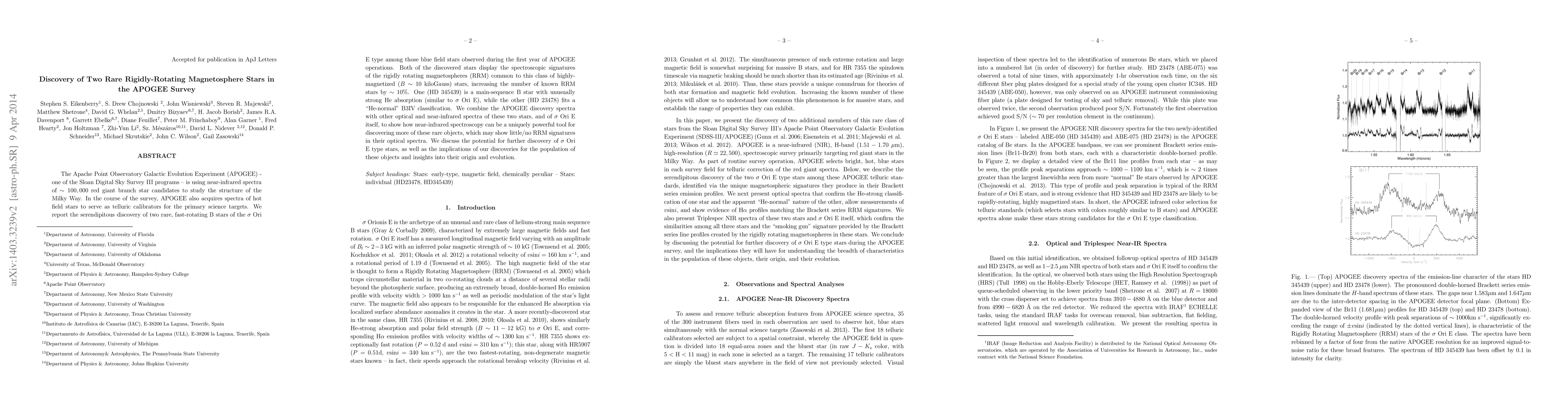 The Apache Point Observatory Galactic Evolution Experiment (APOGEE) - one of the Sloan Digital Sky Survey III programs -- is using near-infrared spectra of $\sim 100,000$ red giant branch star candidates to study the structure of the Milky Way. In the course of the survey, APOGEE also acquires spectra of hot field stars to serve as telluric calibrators for the primary science targets. We report the serendipitous discovery of two rare, fast-rotating B stars of the $\sigma$ Ori E type among those blue field stars observed during the first year of APOGEE operations. Both of the discovered stars display the spectroscopic signatures of the rigidly rotating magnetospheres (RRM) common to this class of highly-magnetized ($B \sim 10$ kiloGauss) stars, increasing the number of known RRM stars by $\sim 10 \%$. One (HD 345439) is a main-sequence B star with unusually strong He absorption (similar to $\sigma$ Ori E), while the other (HD 23478) fits a "He-normal" B3IV classification. We combine the APOGEE discovery spectra with other optical and near-infrared spectra of these two stars, and of $\sigma$ Ori E itself, to show how near-infrared spectroscopy can be a uniquely powerful tool for discovering more of these rare objects, which may show little/no RRM signatures in their optical spectra. We discuss the potential for further discovery of $\sigma$ Ori E type stars, as well as the implications of our discoveries for the population of these objects and insights into their origin and evolution.