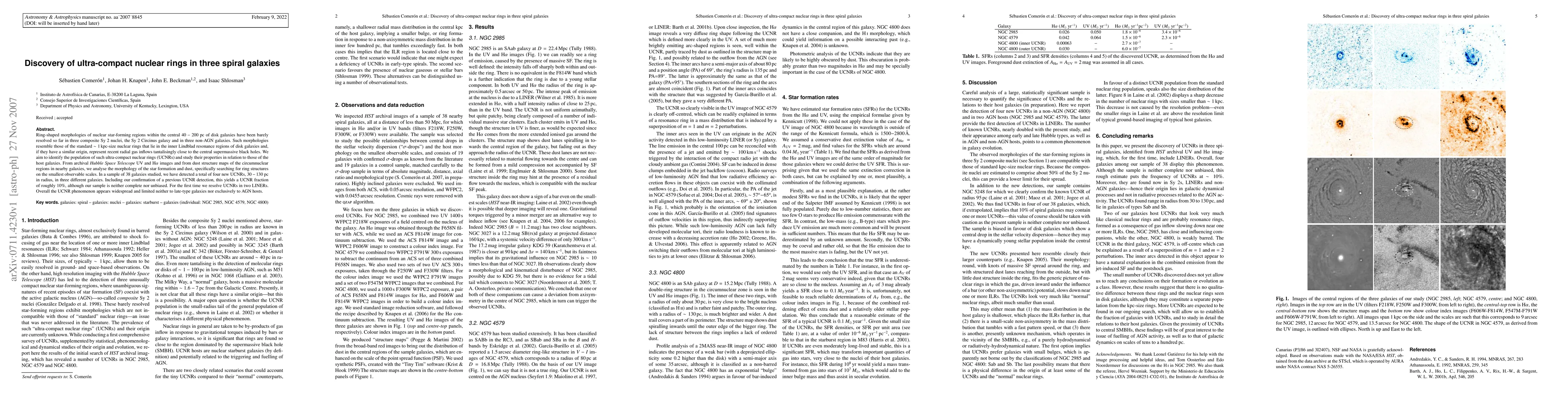 Ring-shaped morphologies of nuclear star-forming regions within the central 40-200 pc of disk galaxies have been barely resolved so far in three composite Sy2 nuclei, the Sy2 Circinus galaxy and in three non-AGN galaxies. Such morphologies resemble those of the standard 1 kpc-size nuclear rings that lie in the inner Lindblad resonance regions of disk galaxies and, if they have a similar origin, represent recent radial gas inflows tantalisingly close to the central supermassive black holes. We aim to identify the population of such ultra-compact nuclear rings (UCNRs) and study their properties in relation to those of the host galaxies. From archival Hubble Space Telescope UV and Halpha images and from dust structure maps of the circumnuclear regions in nearby galaxies, we analyse the morphology of the star formation and dust, specifically searching for ring structures on the smallest observable scales. In a sample of 38 galaxies studied, we have detected a total of four new UCNRs, 30-130 pc in radius, in three different galaxies. Including our confirmation of a previous UCNR detection, this yields a UCNR fraction of roughly 10%, although our sample is neither complete nor unbiased. For the first time we resolve UCNRs in two LINERs. Overall the UCNR phenomenon appears widespread and limited neither to late-type galaxies nor exclusively to AGN hosts.