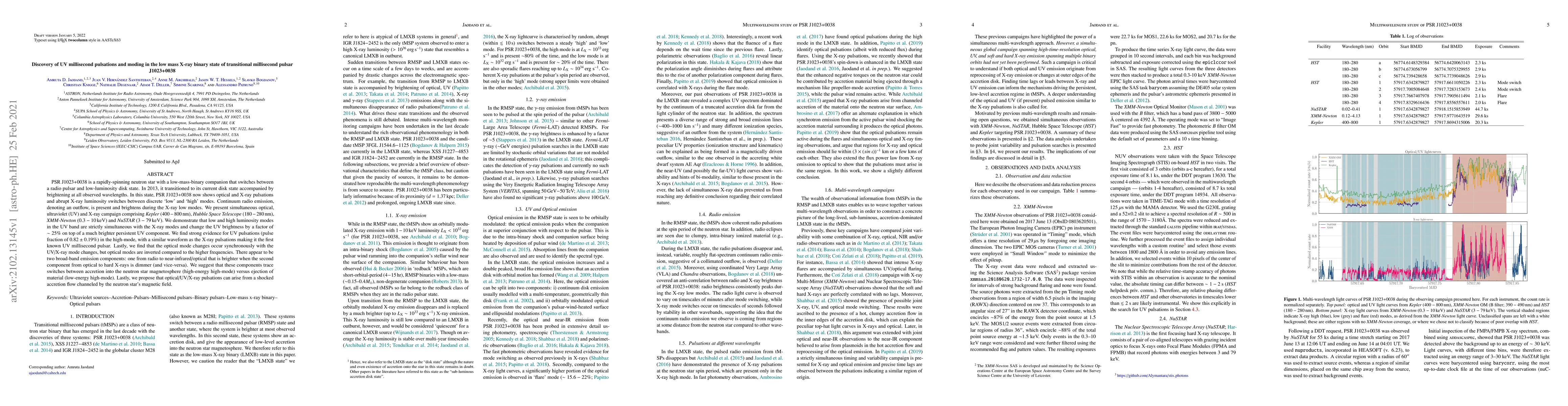 PSR J1023+0038 is a rapidly-spinning neutron star with a low-mass-binary companion that switches between a radio pulsar and low-luminosity disk state. In 2013, it transitioned to its current disk state accompanied by brightening at all observed wavelengths. In this state, PSR J1023+0038 now shows optical and X-ray pulsations and abrupt X-ray luminosity switches between discrete 'low' and 'high' modes. Continuum radio emission, denoting an outflow, is also present and brightens during the X-ray low modes. Here, we present a simultaneous optical, ultraviolet (UV) and X-ray campaign comprising Kepler ($400-800$ nm), Hubble Space Telescope ($180-280$ nm), XMM-Newton ($0.3-10$ keV) and NuSTAR ($3 - 79$ keV). We demonstrate that low and high luminosity modes in the UV band are strictly simultaneous with the X-ray modes and change the UV brightness by a factor of $\sim25$\% on top of a much brighter persistent UV component. We find strong evidence for UV pulsations (pulse fraction of $0.82\pm0.19$\%) in the high-mode, with a similar waveform as the X-ray pulsations making it the first known UV millisecond pulsar. Lastly, we find that the optical mode changes occur synchronously with the UV/X-ray mode changes, but optical modes are inverted compared to the higher frequencies. There appear to be two broad-band emission components: one from radio to near-infrared/optical that is brighter when the second component from optical to hard X-rays is dimmer (and vice-versa). We suggest that these components trace switches between accretion into the neutron star magnetosphere (high-energy high-mode) versus ejection of material (low-energy high-mode). Lastly, we propose that optical/UV/X-ray pulsations can arise from a shocked accretion flow channeled by the neutron star's magnetic field.