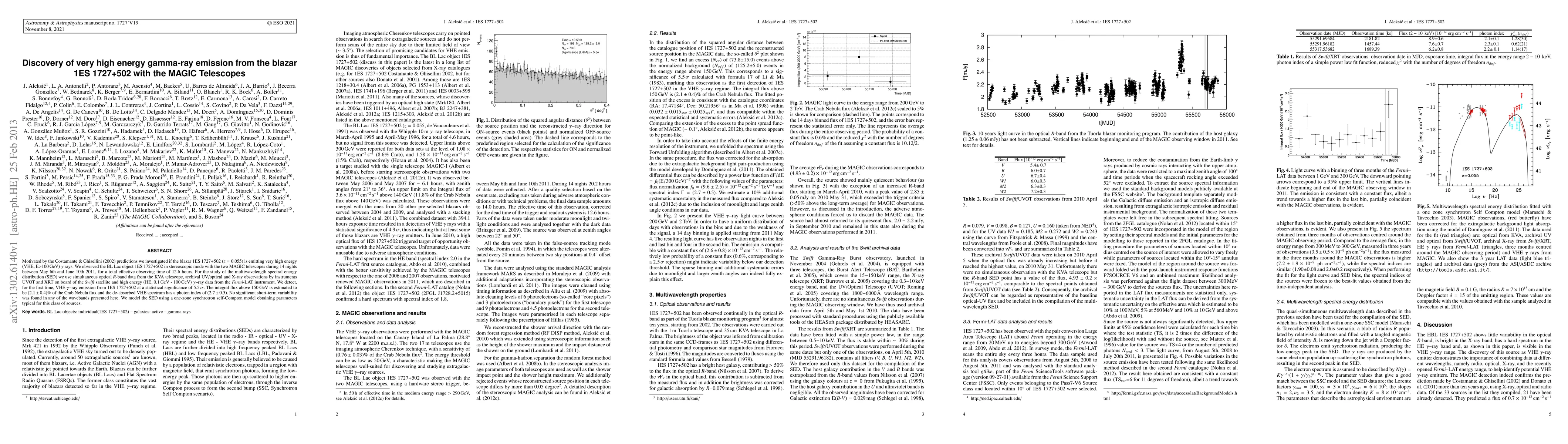 Motivated by the Costamante & Ghisellini (2002) predictions we investigated if the blazar 1ES 1727+502 (z=0.055) is emitting very high energy (VHE, E>100 GeV) gamma rays. We observed the BL Lac object 1ES 1727+502 in stereoscopic mode with the two MAGIC telescopes during 14 nights between May 6th and June 10th 2011, for a total effective observing time of 12.6 hours. For the study of the multiwavelength spectral energy distribution (SED) we use simultaneous optical R-band data from the KVA telescope, archival UV/optical and X-ray observations by instruments UVOT and XRT on board of the Swift satellite and high energy (HE, 0.1 GeV - 100 GeV) gamma-ray data from the Fermi-LAT instrument. We detect, for the first time, VHE gamma-ray emission from 1ES 1727+502 at a statistical significance of 5.5 sigma. The integral flux above 150 GeV is estimated to be (2.1\pm0.4)% of the Crab Nebula flux and the de-absorbed VHE spectrum has a photon index of (2.7\pm0.5). No significant short-term variability was found in any of the wavebands presented here. We model the SED using a one-zone synchrotron self-Compton model obtaining parameters typical for this class of sources.