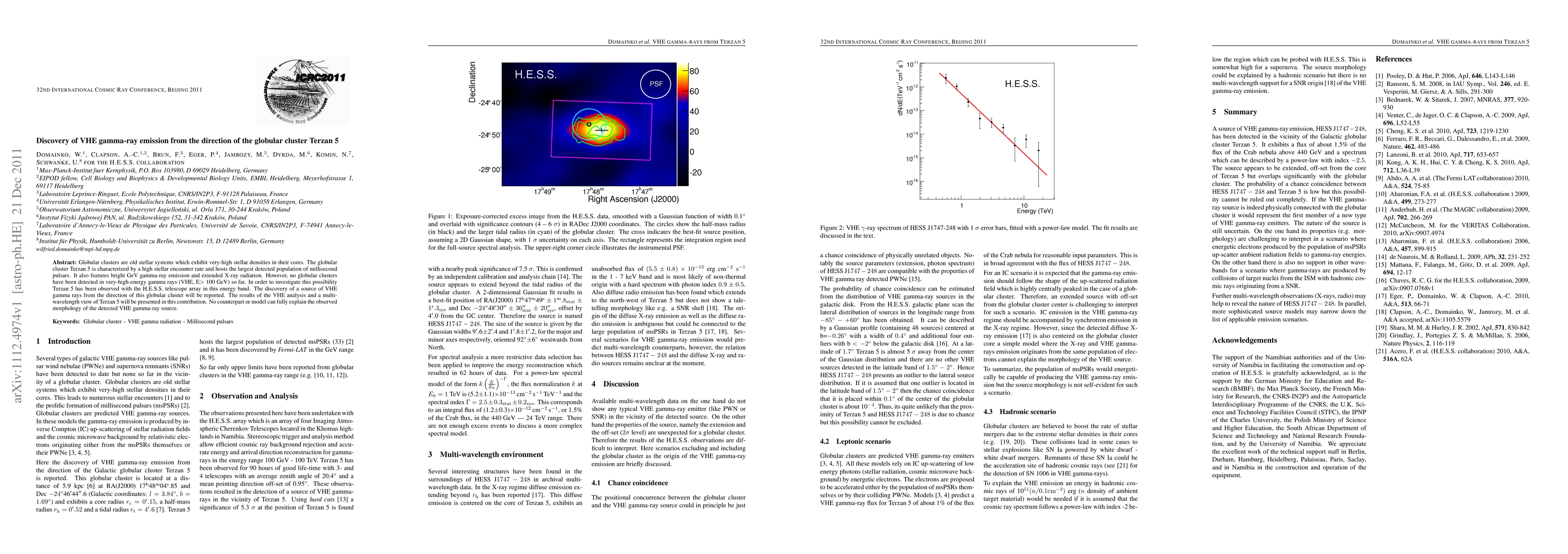 The H.E.S.S. telescope array detected VHE gamma-ray emission from the globular cluster Terzan 5, marking the first detection of such emission from a globular cluster. The observed morphology of the source remains unexplained by current models.