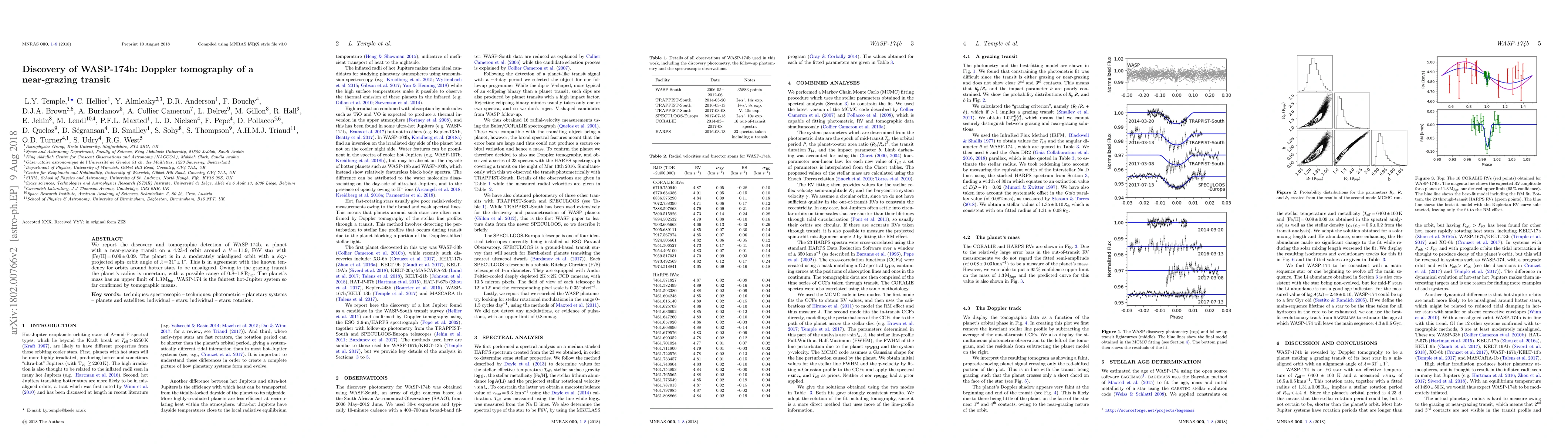 The discovery of WASP-174b, a misaligned hot Jupiter with a near-grazing transit, reveals a planet with an uncertain radius and an upper mass limit of 1.3 Jupiter masses, observed around a faint F6V star.
