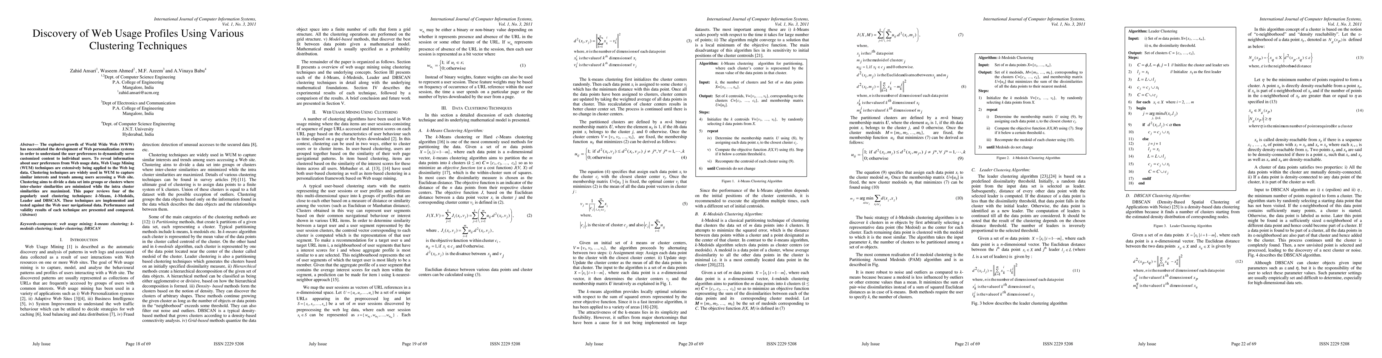This paper explores the application of four clustering techniques—k-Means, k-Medoids, Leader, and DBSCAN—to Web Usage Mining for discovering user profiles from Web log data. The study evaluates the performance and validity of each method through testing on Web navigational data.