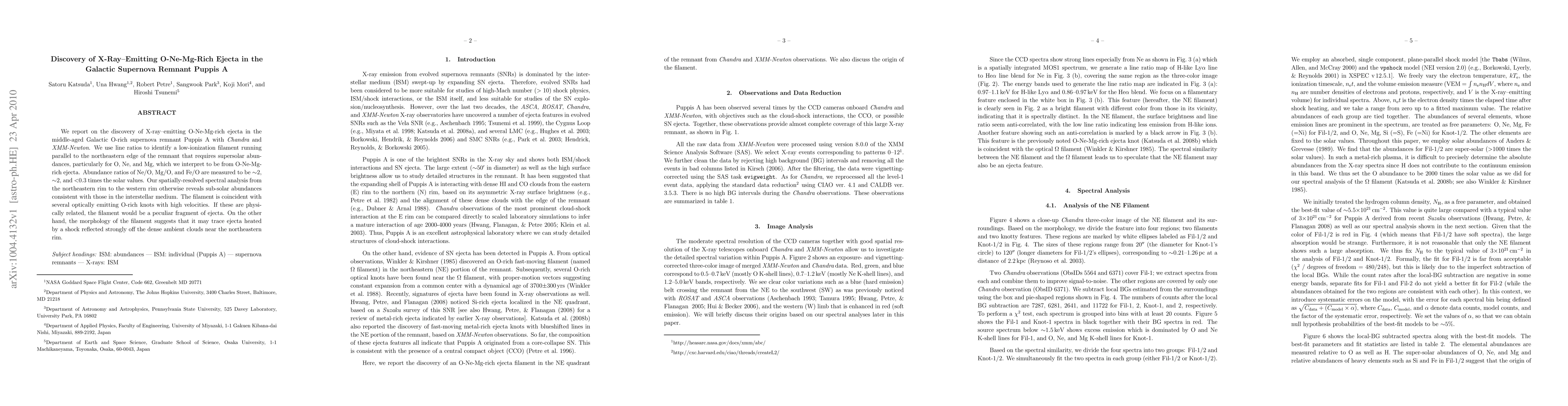 This paper reports the discovery of X-ray-emitting O-Ne-Mg-rich ejecta in the supernova remnant Puppis A using Chandra and XMM-Newton. The study reveals a low-ionization filament with supersolar abundances of O, Ne, and Mg, suggesting it is a peculiar fragment of supernova ejecta.
