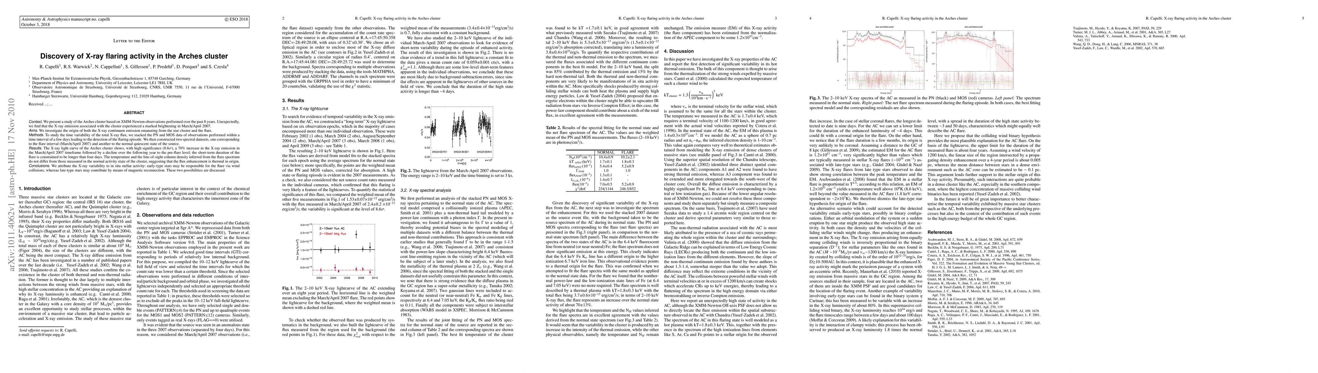 We present a study of the Arches cluster based on XMM-Newton observations performed over the past 8 years. Unexpectedly, we find that the X-ray emission associated with the cluster experienced a marked brightening in March/April 2007. We investigate the origin of both the X-ray continuum emission emanating from the star cluster and the flare. To study the time variability of the total X-ray flux, we stacked the PN and MOS data of observations performed within a time interval of a few days leading to the detection of the flaring episode. We then constructed two spectral datasets, one corresponding to the flare interval (March/April 2007) and another to the normal quiescent state of the source. The X-ray light curve of the Arches cluster shows, with high significance (8.6 sigma), a 70% increase in the X-ray emission in the March/April 2007 timeframe followed by a decline over the following year to the pre-flare level; the short-term duration of the flare is constrained to be longer than four days. The temperature and the line-of-sight column density inferred from the flare spectrum do not differ from those measured in the normal activity state of the cluster, suggesting that the flux enhancement is thermal in origin. We attribute the X-ray variability to in situ stellar activity: early-type stars may be responsible for the flare via wind collisions, whereas late-type stars may contribute by means of magnetic reconnection. These two possibilities are discussed.