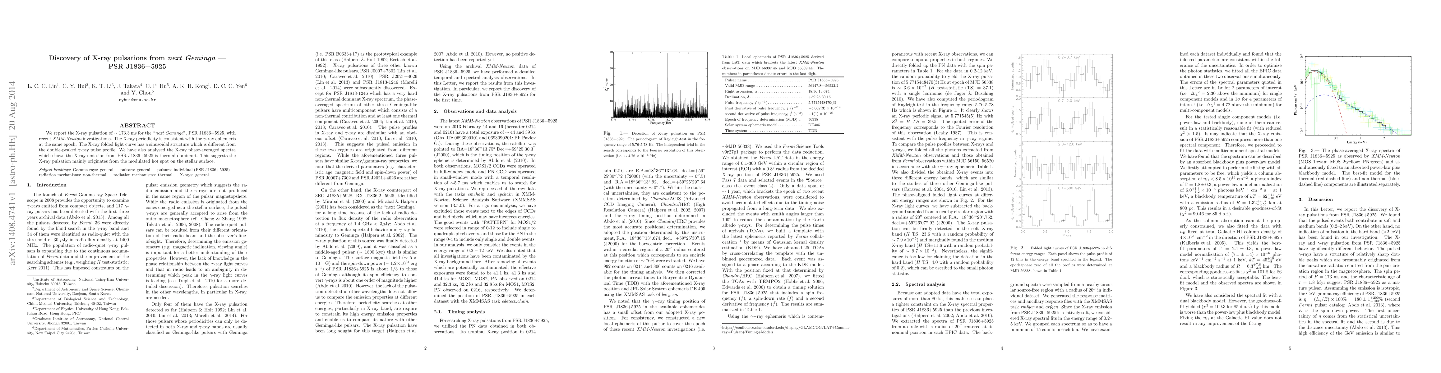 We report the X-ray pulsation of ~173.3 ms for the "next Geminga", PSR J1836+5925, with recent XMM-Newton investigations. The X-ray periodicity is consistent wtih the gamma-ray ephemeris at the same epoch. The X-ray folded light curve has a sinusoidal structure which is different from the double-peaked gamma-ray pulse profile. We have also analysed the X-ray phase-averaged spectra which shows the X-ray emission from PSR J1836+5925 is thermal dominant. This suggests the X-ray pulsation mainly originates from the modulated hot spot on the stellar surface.