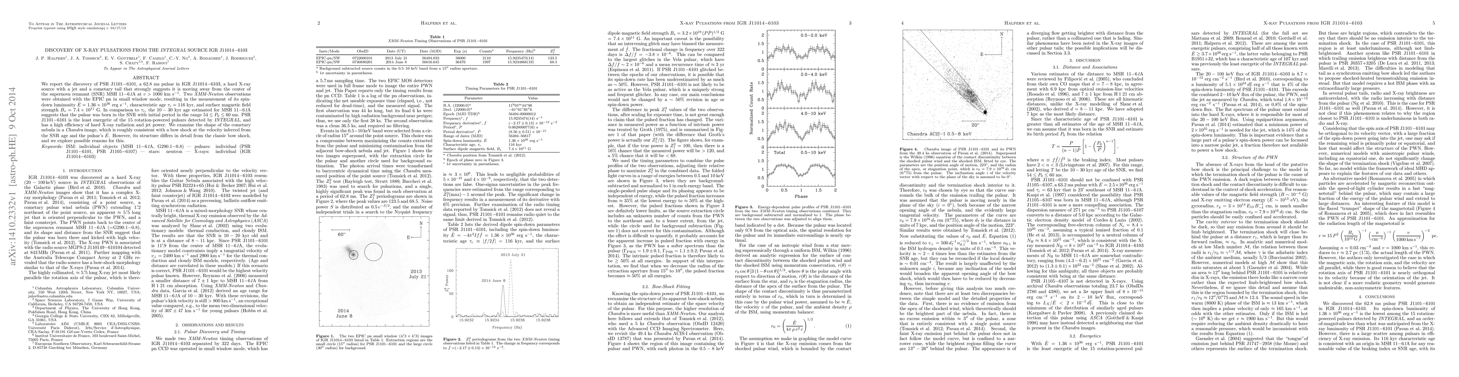 We report the discovery of PSR J1101-6101, a 62.8 ms pulsar in IGR J11014-6103, a hard X-ray source with a jet and a cometary tail that strongly suggests it is moving away from the center of the supernova remnant (SNR) MSH 11-61A at v>1000 km/s. Two XMM-Newton observations were obtained with the EPIC pn in small window mode, resulting in the measurement of its spin-down luminosity E_dot = 1.36e36 erg/s, characteristic age Tau_c = 116 kyr, and surface magnetic field strength B_s = 7.4e11 G. In comparison to Tau_c, the 10-30 kyr age estimated for MSH 11-61A suggests that the pulsar was born in the SNR with initial period in the range 54 < P_0 < 60 ms. PSR J1101-6101 is the least energetic of the 15 rotation-powered pulsars detected by INTEGRAL, and has a high efficiency of hard X-ray radiation and jet power. We examine the shape of the cometary nebula in a Chandra image, which is roughly consistent with a bow shock at the velocity inferred from the SNR age and the pulsar's E-dot. However, its structure differs in detail from the classic bow shock, and we explore possible reasons for this.
