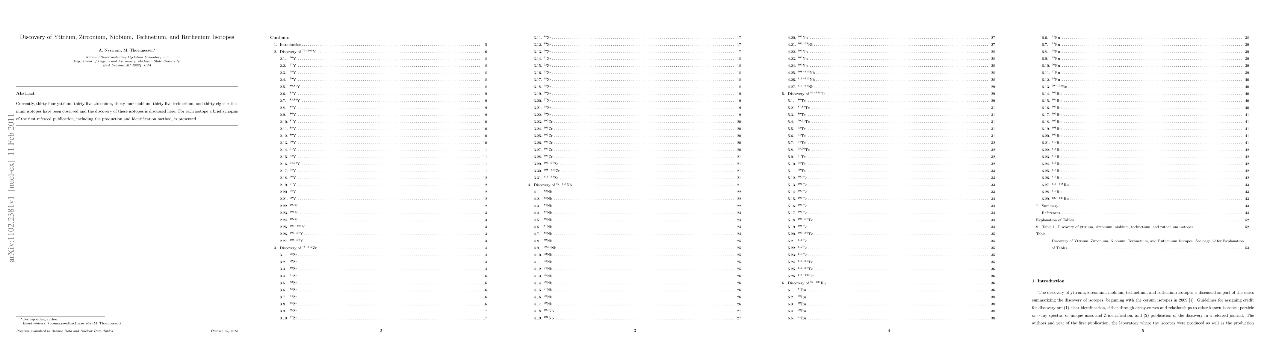 This paper discusses the discovery of thirty-four yttrium, thirty-five zirconium, thirty-four niobium, thirty-five technetium, and thirty-eight ruthenium isotopes, detailing the production and identification methods used in the first refereed publication for each isotope.