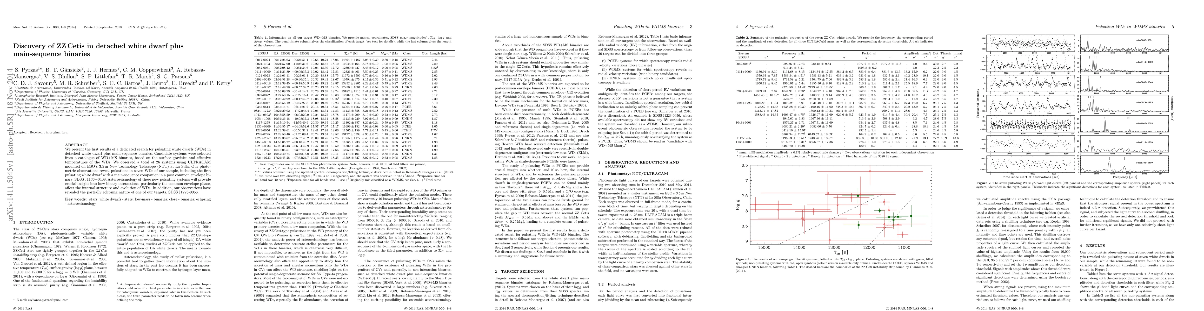 We present the first results of a dedicated search for pulsating white dwarfs (WDs) in detached white dwarf plus main-sequence binaries. Candidate systems were selected from a catalogue of WD+MS binaries, based on the surface gravities and effective temperatures of the WDs. We observed a total of 26 systems using ULTRACAM mounted on ESO's 3.5m New Technology Telescope (NTT) at La Silla. Our photometric observations reveal pulsations in seven WDs of our sample, including the first pulsating white dwarf with a main-sequence companion in a post common envelope binary, SDSSJ1136+0409. Asteroseismology of these new pulsating systems will provide crucial insight into how binary interactions, particularly the common envelope phase, affect the internal structure and evolution of WDs. In addition, our observations have revealed the partially eclipsing nature of one of our targets, SDSSJ1223-0056.