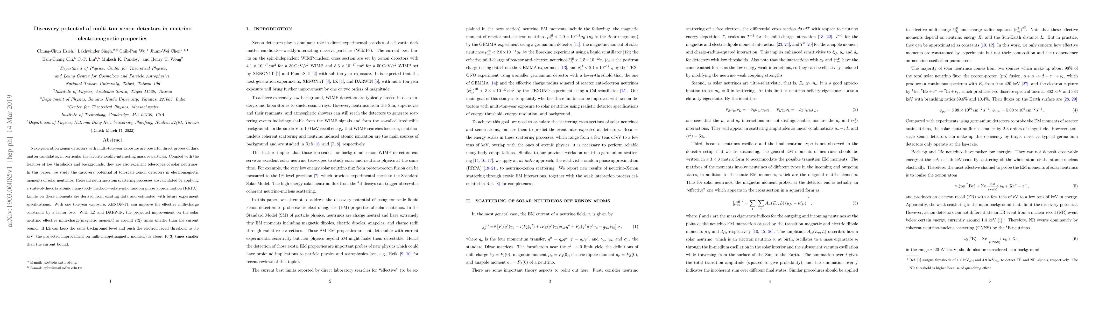 Next-generation xenon detectors with multi-ton-year exposure are powerful direct probes of dark matter candidates, in particular the favorite weakly-interacting massive particles. Coupled with the features of low thresholds and backgrounds, they are also excellent telescopes of solar neutrinos. In this paper, we study the discovery potential of ton-scale xenon detectors in electromagnetic moments of solar neutrinos. Relevant neutrino-atom scattering processes are calculated by applying a state-of-the-arts atomic many-body method--relativistic random phase approximation (RRPA). Limits on these moments are derived from existing data and estimated with future experiment specifications. With one ton-year exposure, XENON-1T can improve the effective milli-charge constraint by a factor two. With LZ and DARWIN, the projected improvement on the solar neutrino effective milli-charge(magnetic moment) is around 7(2) times smaller than the current bound. If LZ can keep the same background level and push the electron recoil threshold to 0.5 keV, the projected improvement on milli-charge(magnetic moment) is about 10(3) times smaller than the current bound.