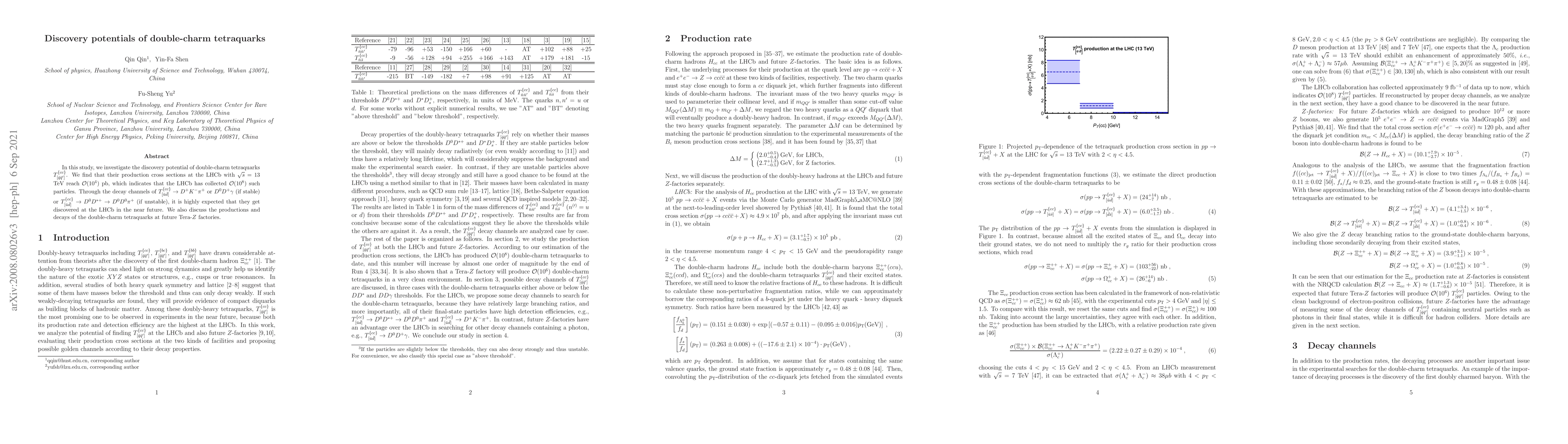 In this study, we investigate the discovery potential of double-charm tetraquarks $T^{\{cc\}}_{[\bar{q}\bar{q}']}$. We find that their production cross sections at the LHCb with $\sqrt{s} = 13$ TeV reach $\mathcal{O}(10^4)$ pb, which indicates that the LHCb has collected $\mathcal{O}(10^8)$ such particles. Through the decay channels of $T^{\{cc\}}_{[\bar{u}\bar{d}]}\to D^{+}K^{-}\pi^{+}$ or $D^0D^+\gamma$ (if stable) or $T^{\{cc\}}_{[\bar{u}\bar{d}]}\to D^0D^{*+}\to D^0D^0\pi^+$ (if unstable), it is highly expected that they get discovered at the LHCb in the near future. We also discuss the productions and decays of the double-charm tetraquarks at future Tera-$Z$ factories.