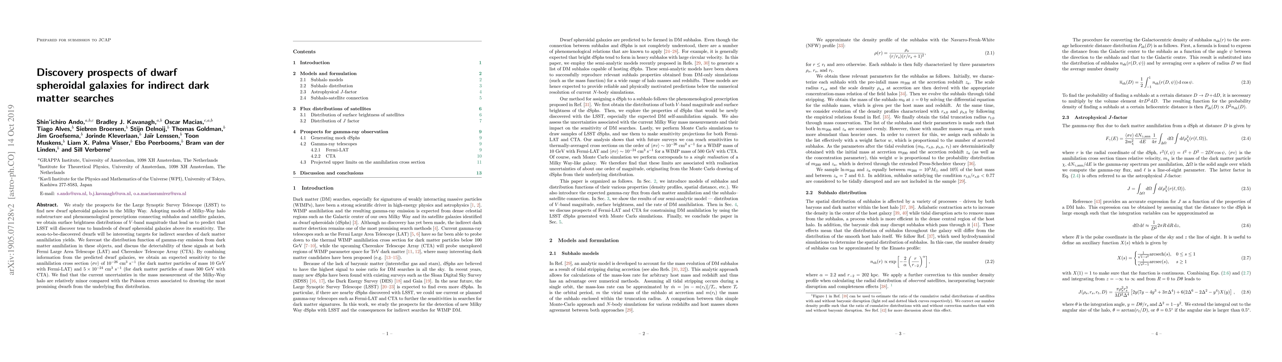 We study the prospects for the Large Synoptic Survey Telescope (LSST) to find new dwarf spheroidal galaxies in the Milky Way. Adopting models of Milky-Way halo substructure and phenomenological prescriptions connecting subhalos and satellite galaxies, we obtain surface brightness distributions of $V$-band magnitude that lead us to predict that LSST will discover tens to hundreds of dwarf spheroidal galaxies above its sensitivity. The soon-to-be-discovered dwarfs will be interesting targets for indirect searches of dark matter annihilation yields. We forecast the distribution function of gamma-ray emission from dark matter annihilation in these objects, and discuss the detectability of these signals at both Fermi Large Area Telescope (LAT) and Cherenkov Telescope Array (CTA). By combining information from the predicted dwarf galaxies, we obtain an expected sensitivity to the annihilation cross section $\langle \sigma v \rangle$ of $10^{-26}$ cm$^3$ s$^{-1}$ (for dark matter particles of mass 10 GeV with Fermi-LAT) and $5\times 10^{-24}$ cm$^3$ s$^{-1}$ (for dark matter particles of mass 500 GeV with CTA). We find that the current uncertainties in the mass measurement of the Milky-Way halo are relatively minor compared with the Poisson errors associated to drawing the most promising dwarfs from the underlying flux distribution.