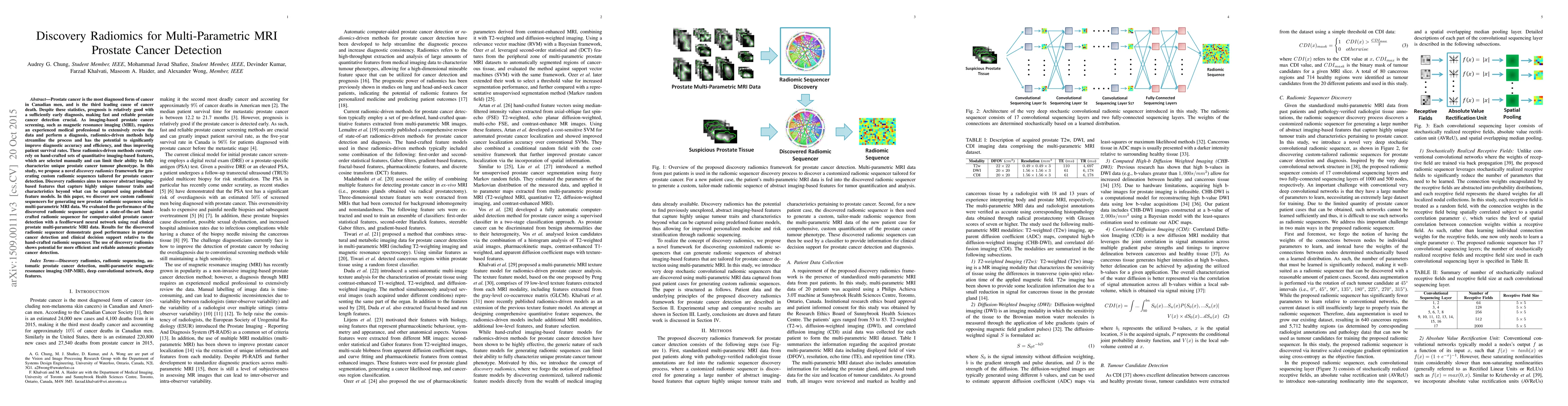 Prostate cancer is the most diagnosed form of cancer in Canadian men, and is the third leading cause of cancer death. Despite these statistics, prognosis is relatively good with a sufficiently early diagnosis, making fast and reliable prostate cancer detection crucial. As imaging-based prostate cancer screening, such as magnetic resonance imaging (MRI), requires an experienced medical professional to extensively review the data and perform a diagnosis, radiomics-driven methods help streamline the process and has the potential to significantly improve diagnostic accuracy and efficiency, and thus improving patient survival rates. These radiomics-driven methods currently rely on hand-crafted sets of quantitative imaging-based features, which are selected manually and can limit their ability to fully characterize unique prostate cancer tumour phenotype. In this study, we propose a novel \textit{discovery radiomics} framework for generating custom radiomic sequences tailored for prostate cancer detection. Discovery radiomics aims to uncover abstract imaging-based features that capture highly unique tumour traits and characteristics beyond what can be captured using predefined feature models. In this paper, we discover new custom radiomic sequencers for generating new prostate radiomic sequences using multi-parametric MRI data. We evaluated the performance of the discovered radiomic sequencer against a state-of-the-art hand-crafted radiomic sequencer for computer-aided prostate cancer detection with a feedforward neural network using real clinical prostate multi-parametric MRI data. Results for the discovered radiomic sequencer demonstrate good performance in prostate cancer detection and clinical decision support relative to the hand-crafted radiomic sequencer. The use of discovery radiomics shows potential for more efficient and reliable automatic prostate cancer detection.