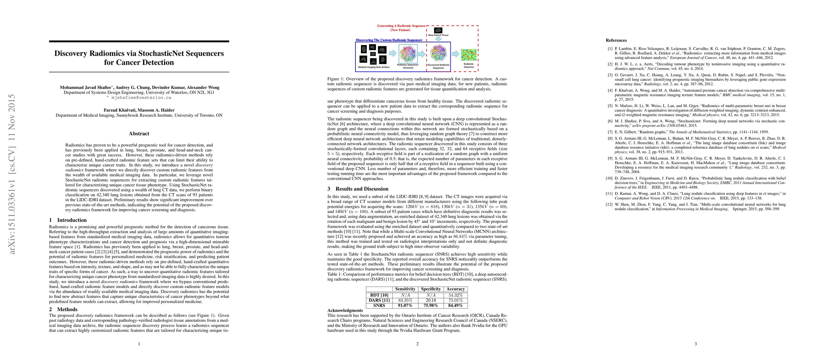 This paper introduces a novel discovery radiomics framework using StochasticNet sequencers to directly extract custom radiomic features from medical imaging data, aiming to better characterize unique cancer traits. Preliminary results show significant improvement over existing methods in classifying lung lesions from the LIDC-IDRI dataset, suggesting enhanced potential for cancer detection and diagnosis.