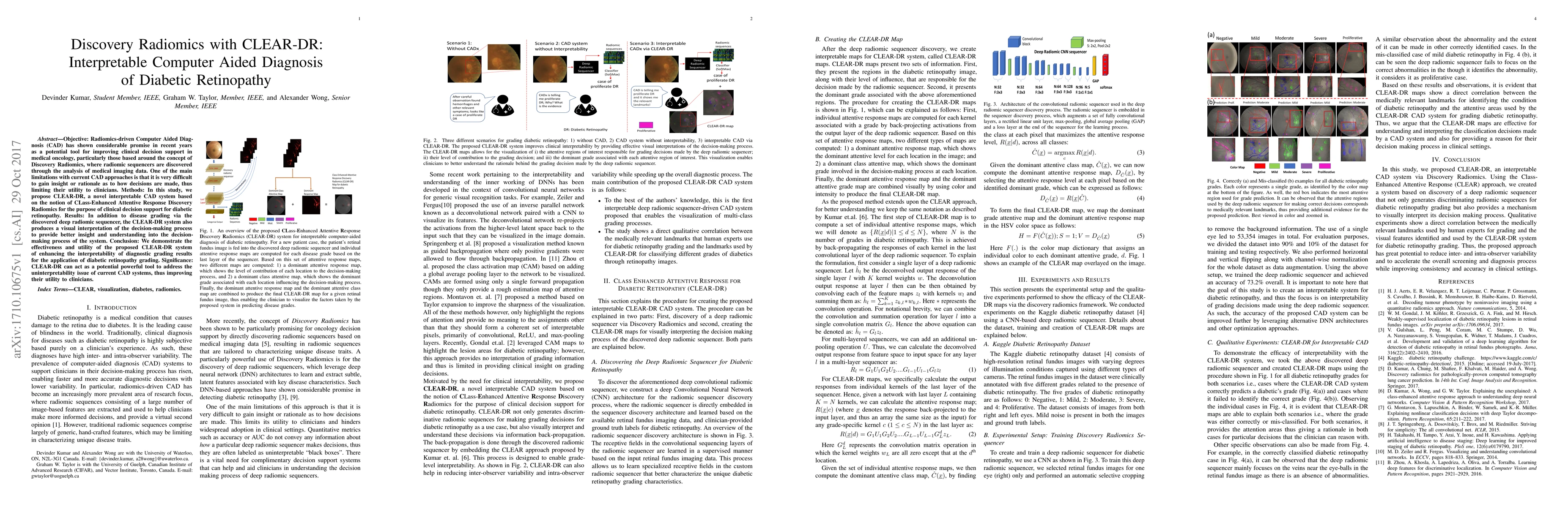 This paper introduces CLEAR-DR, an interpretable Computer Aided Diagnosis system for diabetic retinopathy, which uses Discovery Radiomics to enhance clinical decision support. The system provides visual insights into its decision-making process, addressing the uninterpretability issue of current CAD tools.