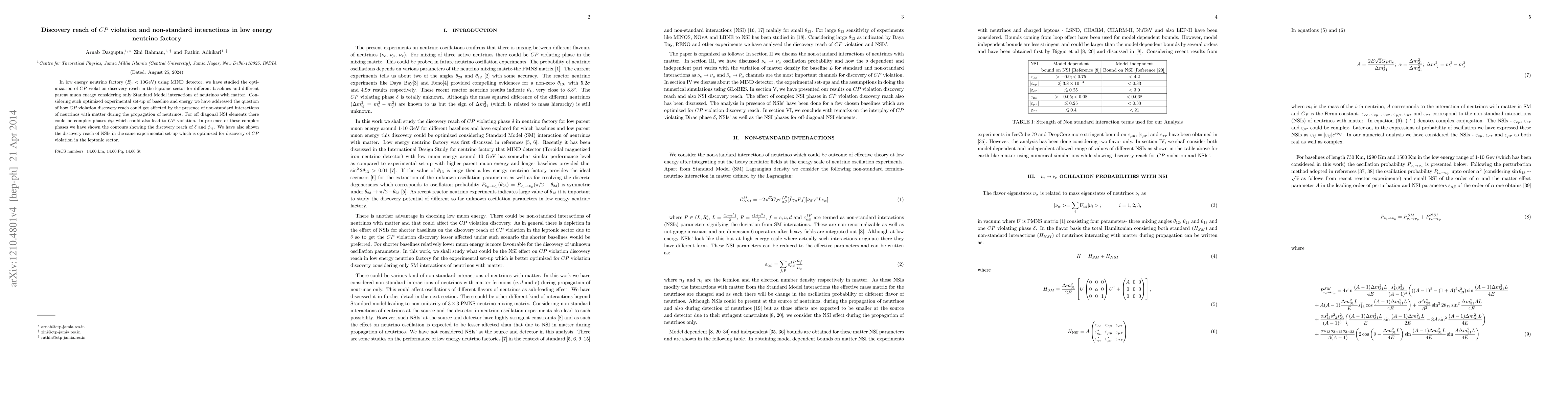 This paper investigates the $CP$ violation discovery reach in a low energy neutrino factory using the MIND detector, optimizing baseline and muon energy. It also examines how non-standard interactions (NSIs) impact this reach, showing contours for $\delta$ and complex phases $\phi_{ij}$ in the presence of NSI.
