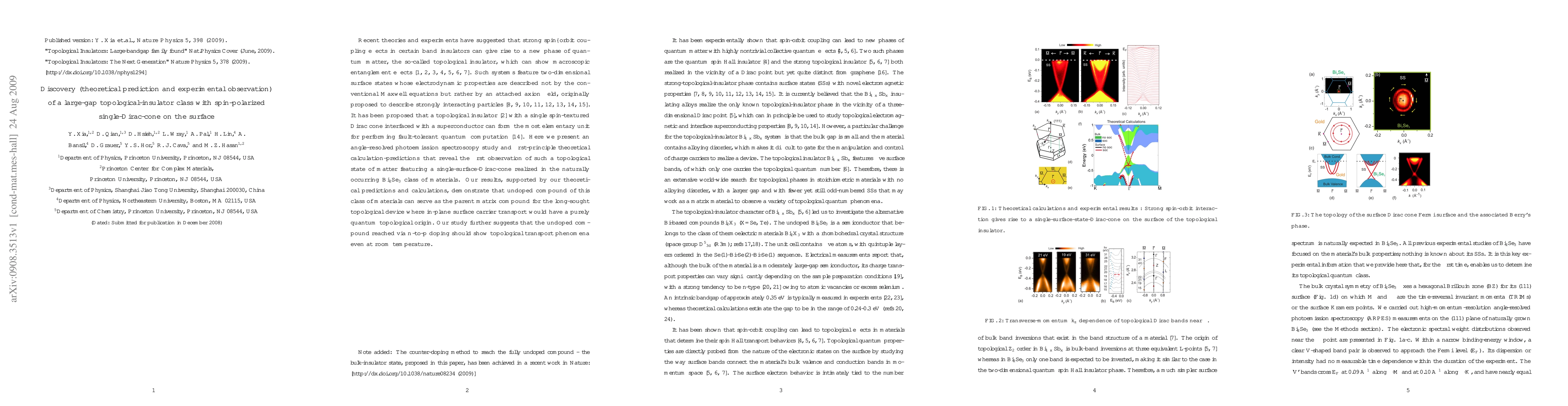 This paper reports the theoretical prediction and experimental observation of a large-gap topological insulator in the naturally occurring Bi$_2$Se$_3$ class, featuring a single spin-polarized Dirac cone on its surface. The study suggests that undoped Bi$_2$Se$_3$ can serve as a matrix for topological quantum devices, with potential for topological transport at room temperature.