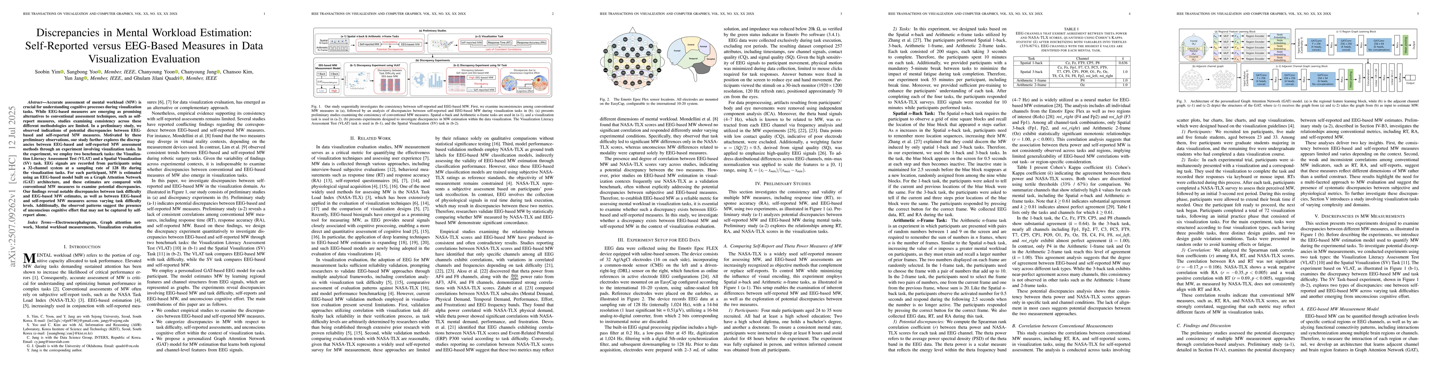 Accurate assessment of mental workload (MW) is crucial for understanding cognitive processes during visualization tasks. While EEG-based measures are emerging as promising alternatives to conventional assessment techniques, such as selfreport measures, studies examining consistency across these different methodologies are limited. In a preliminary study, we observed indications of potential discrepancies between EEGbased and self-reported MW measures. Motivated by these preliminary observations, our study further explores the discrepancies between EEG-based and self-reported MW assessment methods through an experiment involving visualization tasks. In the experiment, we employ two benchmark tasks: the Visualization Literacy Assessment Test (VLAT) and a Spatial Visualization (SV) task. EEG signals are recorded from participants using a 32-channel system at a sampling rate of 128 Hz during the visualization tasks. For each participant, MW is estimated using an EEG-based model built on a Graph Attention Network (GAT) architecture, and these estimates are compared with conventional MW measures to examine potential discrepancies. Our findings reveal notable discrepancies between task difficulty and EEG-based MW estimates, as well as between EEG-based and self-reported MW measures across varying task difficulty levels. Additionally, the observed patterns suggest the presence of unconscious cognitive effort that may not be captured by selfreport alone.