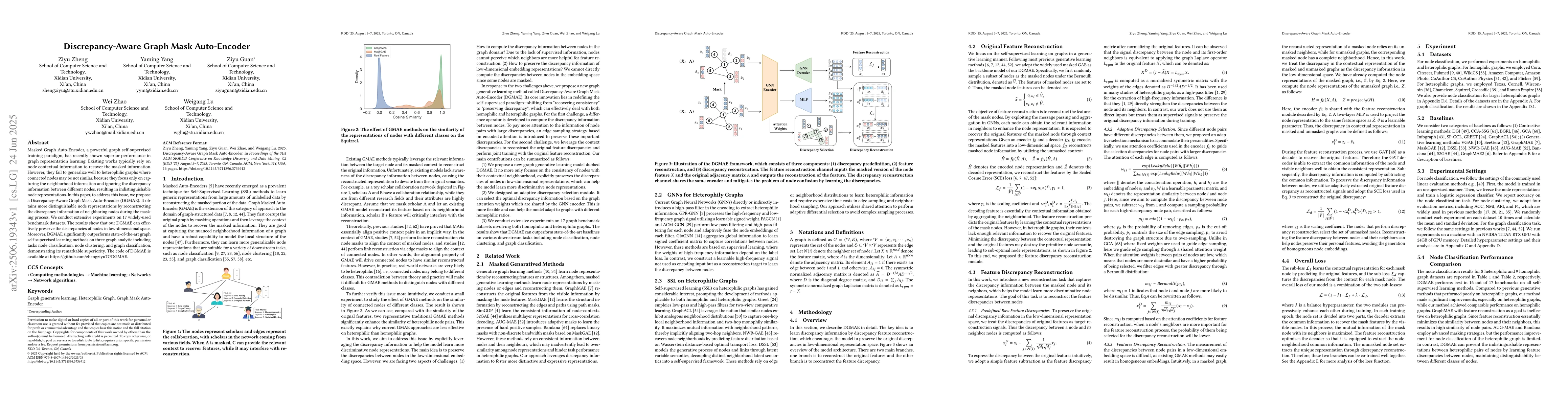 Masked Graph Auto-Encoder, a powerful graph self-supervised training paradigm, has recently shown superior performance in graph representation learning. Existing works typically rely on node contextual information to recover the masked information. However, they fail to generalize well to heterophilic graphs where connected nodes may be not similar, because they focus only on capturing the neighborhood information and ignoring the discrepancy information between different nodes, resulting in indistinguishable node representations. In this paper, to address this issue, we propose a Discrepancy-Aware Graph Mask Auto-Encoder (DGMAE). It obtains more distinguishable node representations by reconstructing the discrepancy information of neighboring nodes during the masking process. We conduct extensive experiments on 17 widely-used benchmark datasets. The results show that our DGMAE can effectively preserve the discrepancies of nodes in low-dimensional space. Moreover, DGMAE significantly outperforms state-of-the-art graph self-supervised learning methods on three graph analytic including tasks node classification, node clustering, and graph classification, demonstrating its remarkable superiority. The code of DGMAE is available at https://github.com/zhengziyu77/DGMAE.