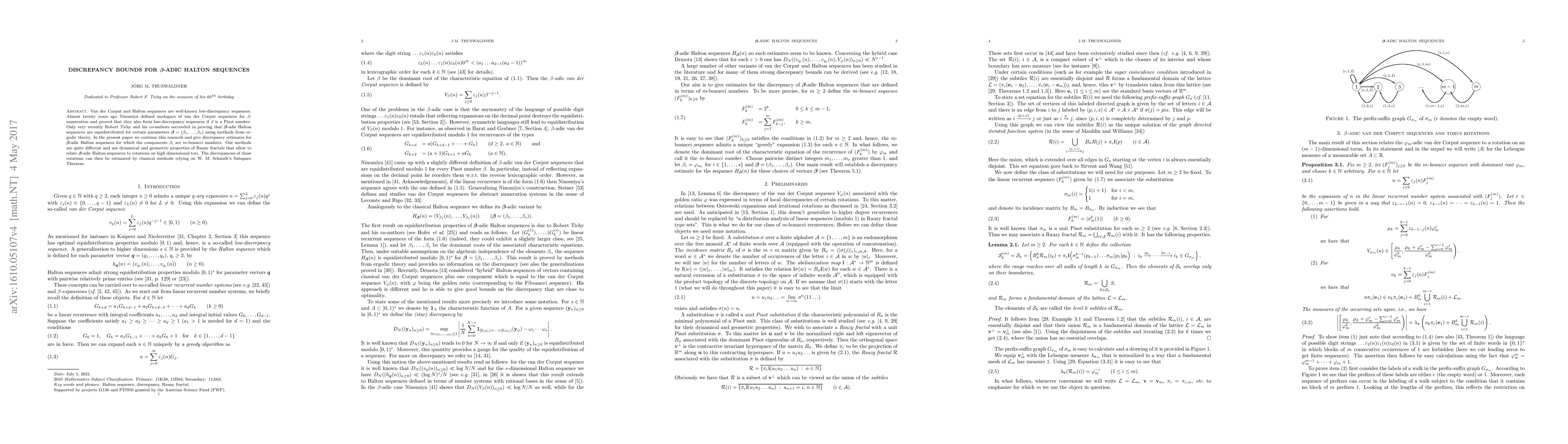 This paper provides discrepancy bounds for $\boldsymbol{\beta}$-adic Halton sequences where $\beta_i$ are $m$-bonacci numbers, employing dynamical and geometric properties of Rauzy fractals and linking them to rotations on high-dimensional tori, ultimately estimating discrepancies via W. M. Schmidt's Subspace Theorem.