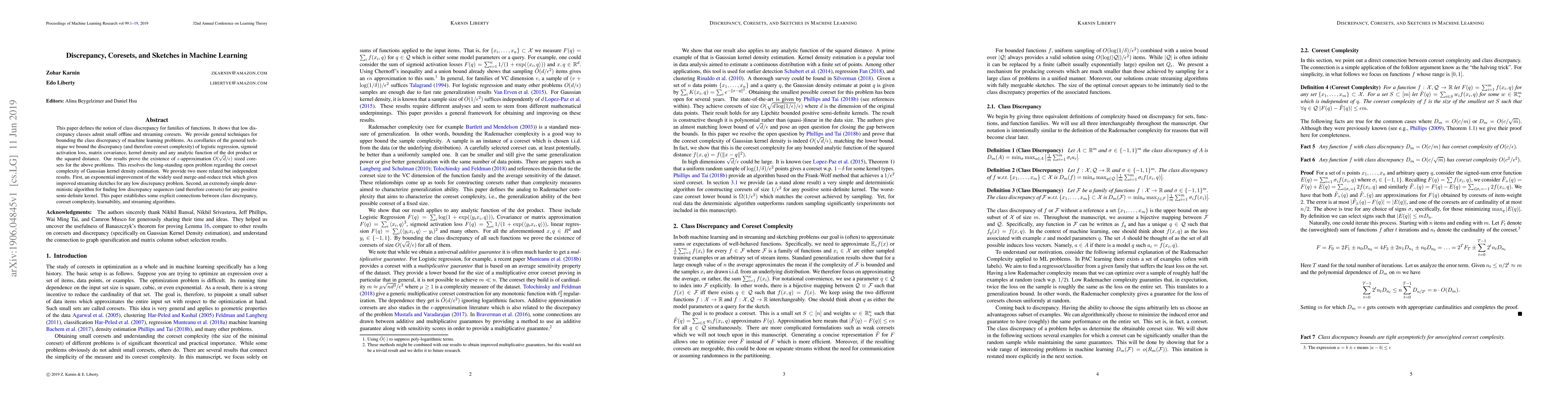 This paper defines the notion of class discrepancy for families of functions. It shows that low discrepancy classes admit small offline and streaming coresets. We provide general techniques for bounding the class discrepancy of machine learning problems. As corollaries of the general technique we bound the discrepancy (and therefore coreset complexity) of logistic regression, sigmoid activation loss, matrix covariance, kernel density and any analytic function of the dot product or the squared distance. Our results prove the existence of epsilon-approximation O(sqrt{d}/epsilon) sized coresets for the above problems. This resolves the long-standing open problem regarding the coreset complexity of Gaussian kernel density estimation. We provide two more related but independent results. First, an exponential improvement of the widely used merge-and-reduce trick which gives improved streaming sketches for any low discrepancy problem. Second, an extremely simple deterministic algorithm for finding low discrepancy sequences (and therefore coresets) for any positive semi-definite kernel. This paper establishes some explicit connections between class discrepancy, coreset complexity, learnability, and streaming algorithms.