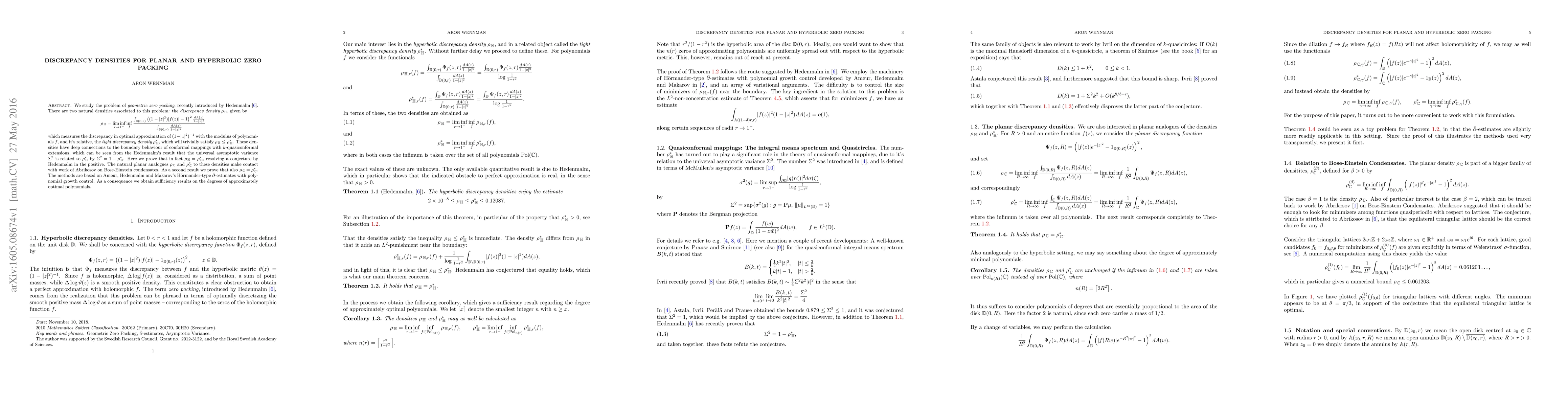 This paper proves that for planar and hyperbolic zero packing, the discrepancy density equals its tight counterpart, resolving a conjecture by Hedenmalm. It also establishes the same equality for planar analogues, connecting to Abrikosov's work on Bose-Einstein condensates. Methods include H"ormander-type u03c0u03b1-estimates with polynomial growth control.