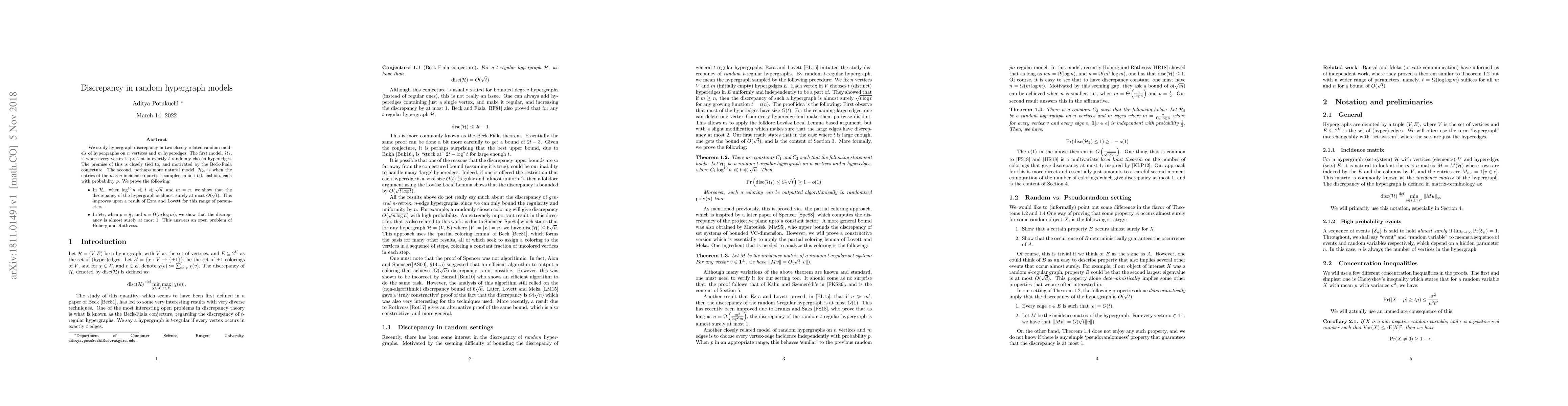 We study hypergraph discrepancy in two closely related random models of hypergraphs on $n$ vertices and $m$ hyperedges. The first model, $\mathcal{H}_1$, is when every vertex is present in exactly $t$ randomly chosen hyperedges. The premise of this is closely tied to, and motivated by the Beck-Fiala conjecture. The second, perhaps more natural model, $\mathcal{H}_2$, is when the entries of the $m \times n$ incidence matrix is sampled in an i.i.d. fashion, each with probability $p$. We prove the following: 1. In $\mathcal{H}_1$, when $\log^{10}n \ll t \ll \sqrt{n}$, and $m = n$, we show that the discrepancy of the hypergraph is almost surely at most $O(\sqrt{t})$. This improves upon a result of Ezra and Lovett for this range of parameters. 2. In $\mathcal{H}_2$, when $p= \frac{1}{2}$, and $n = \Omega(m \log m)$, we show that the discrepancy is almost surely at most $1$. This answers an open problem of Hoberg and Rothvoss.