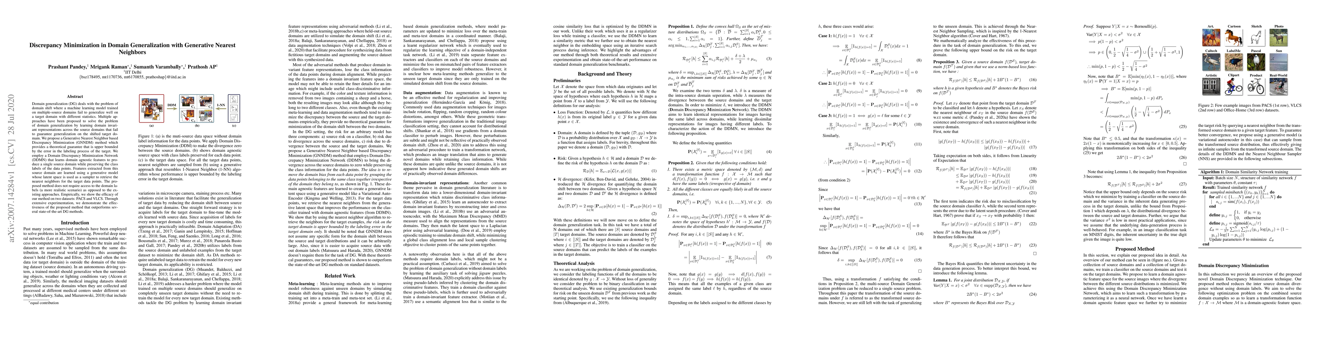 This paper proposes a Generative Nearest Neighbor based Discrepancy Minimization (GNNDM) method for domain generalization, which uses a Domain Discrepancy Minimization Network (DDMN) to learn domain-invariant features. The method outperforms existing approaches and does not require target domain labels, as demonstrated on PACS and VLCS datasets.