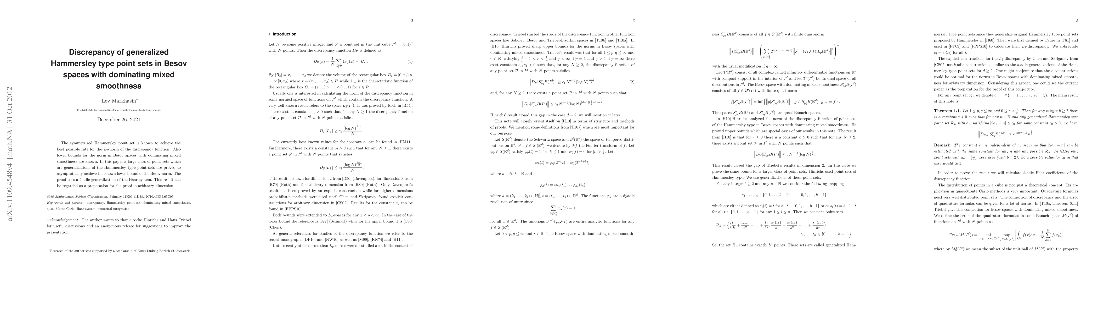 The work extends known results on Hammersley point sets by considering a broader class of generalized Hammersley type point sets and proving their discrepancy properties in Besov spaces.