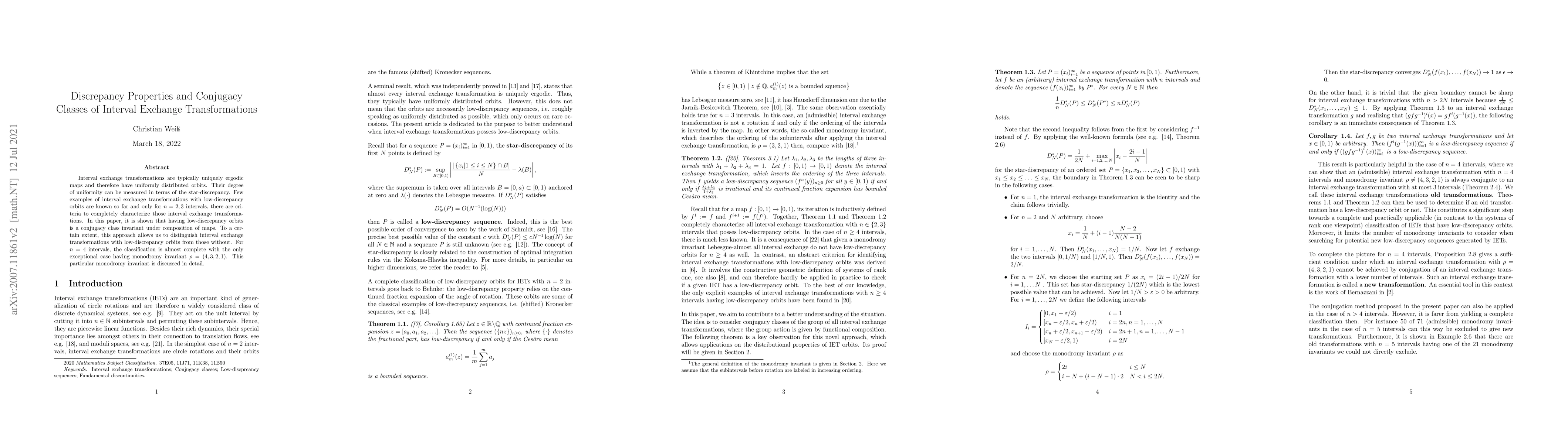 This paper investigates interval exchange transformations, showing that low-discrepancy orbits are a conjugacy class invariant. For $n=4$ intervals, the classification is nearly complete, with the exceptional case involving the monodromy invariant $\rho = (4,3,2,1)$ being thoroughly examined.