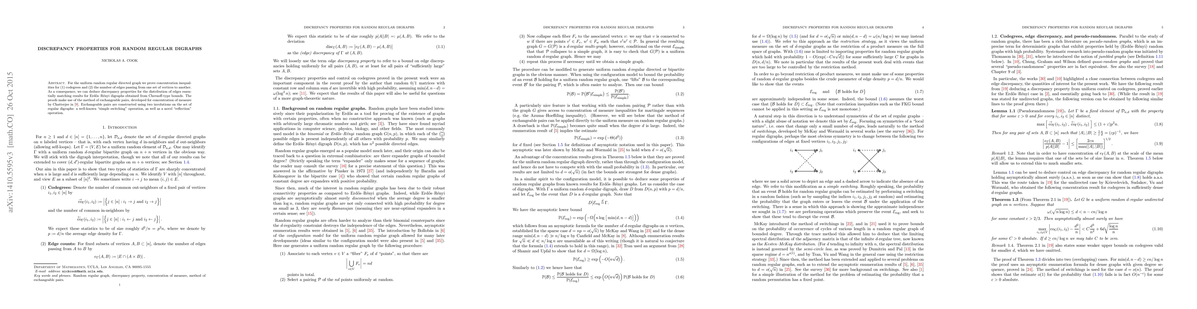 This paper proves concentration inequalities for uniform random regular digraphs, leading to discrepancy properties matching results for Erdós-Rényi digraphs, using the method of exchangeable pairs.