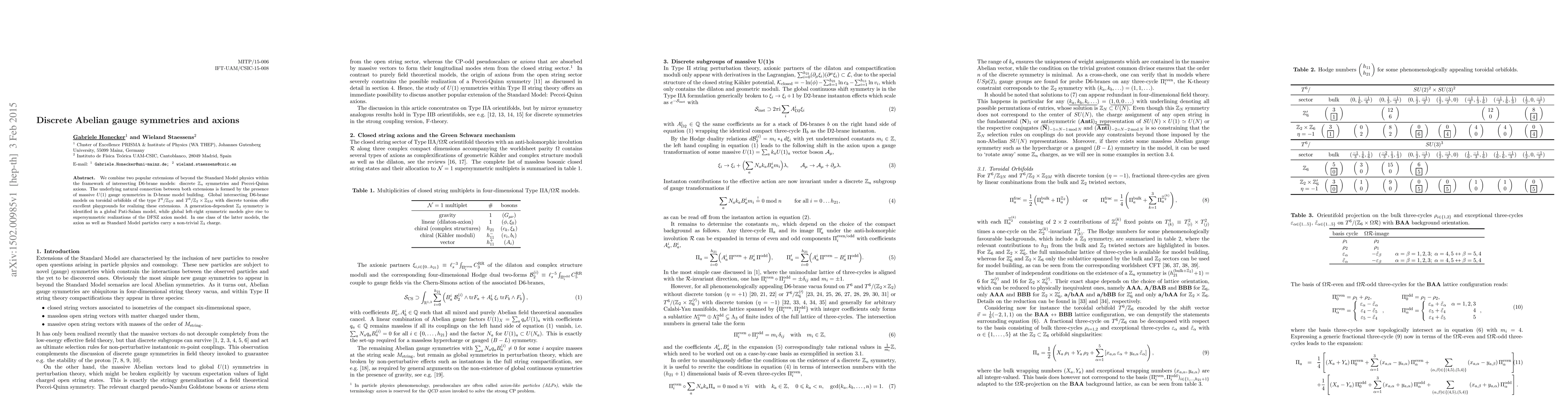 This paper explores the integration of discrete abelian gauge symmetries and Peccei-Quinn axions within intersecting D6-brane models. It demonstrates how these extensions can be realized in global toroidal orbifold models, highlighting the generation-dependent Z2 symmetry and supersymmetric DFSZ axion model realizations.