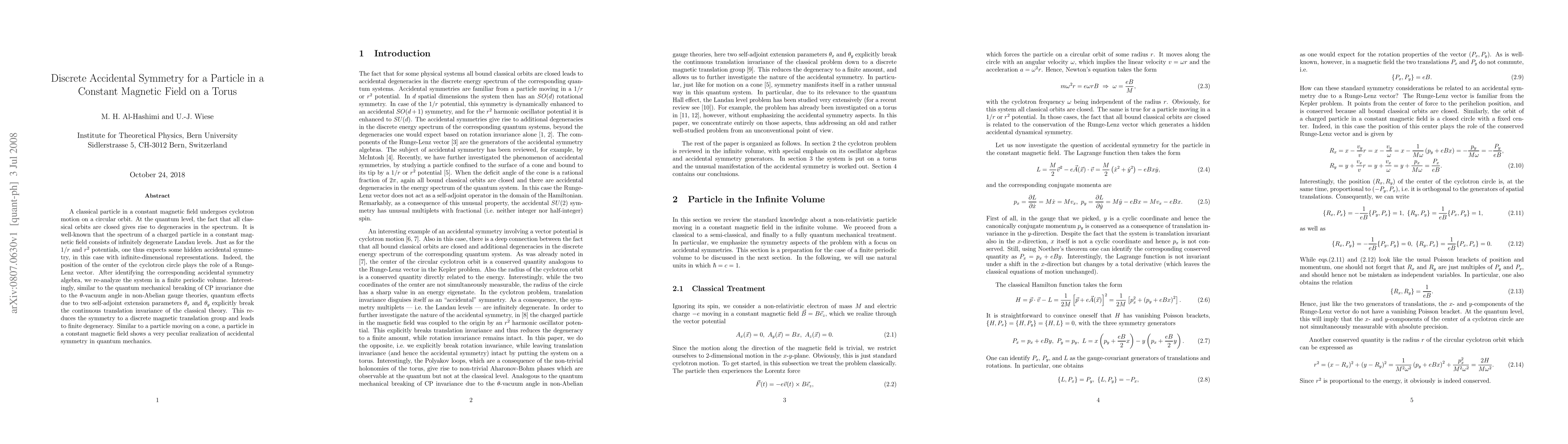 A classical particle in a constant magnetic field undergoes cyclotron motion on a circular orbit. At the quantum level, the fact that all classical orbits are closed gives rise to degeneracies in the spectrum. It is well-known that the spectrum of a charged particle in a constant magnetic field consists of infinitely degenerate Landau levels. Just as for the $1/r$ and $r^2$ potentials, one thus expects some hidden accidental symmetry, in this case with infinite-dimensional representations. Indeed, the position of the center of the cyclotron circle plays the role of a Runge-Lenz vector. After identifying the corresponding accidental symmetry algebra, we re-analyze the system in a finite periodic volume. Interestingly, similar to the quantum mechanical breaking of CP invariance due to the $\theta$-vacuum angle in non-Abelian gauge theories, quantum effects due to two self-adjoint extension parameters $\theta_x$ and $\theta_y$ explicitly break the continuous translation invariance of the classical theory. This reduces the symmetry to a discrete magnetic translation group and leads to finite degeneracy. Similar to a particle moving on a cone, a particle in a constant magnetic field shows a very peculiar realization of accidental symmetry in quantum mechanics.