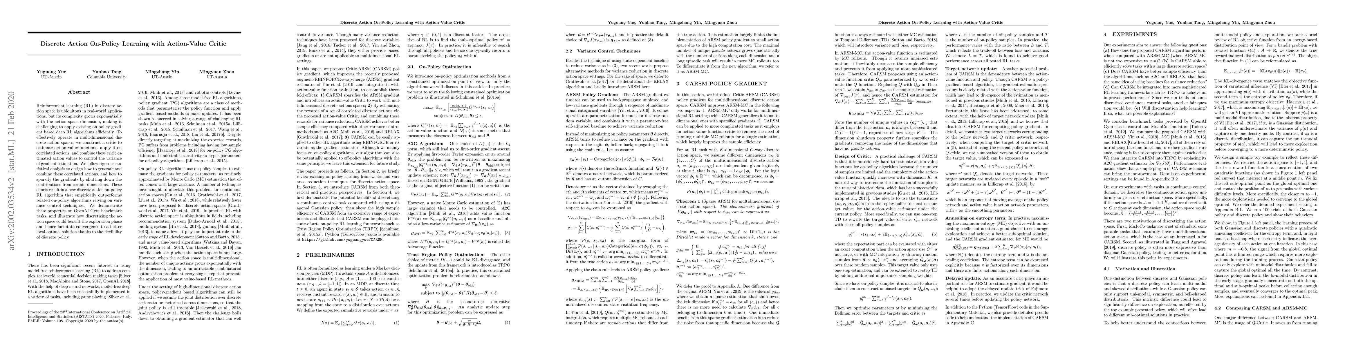 This paper proposes a novel on-policy reinforcement learning algorithm for high-dimensional discrete action spaces by constructing a critic to estimate action-value functions and combining correlated actions to control gradient variance. The method outperforms existing on-policy algorithms, as demonstrated on benchmark tasks, by facilitating better exploration and convergence through discretized action spaces.