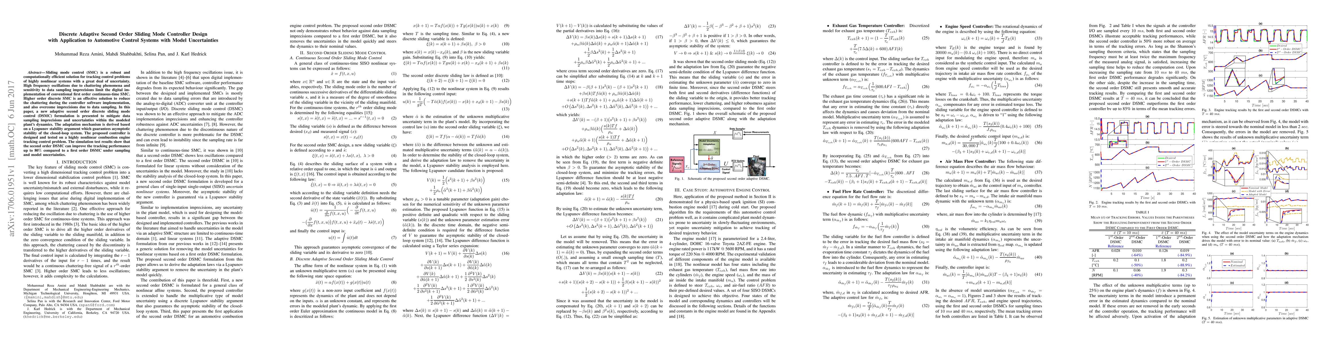 Sliding mode control (SMC) is a robust and computationally efficient solution for tracking control problems of highly nonlinear systems with a great deal of uncertainty. High frequency oscillations due to chattering phenomena and sensitivity to data sampling imprecisions limit the digital implementation of conventional first order continuous-time SMC. Higher order discrete SMC is an effective solution to reduce the chattering during the controller software implementation, and also overcome imprecisions due to data sampling. In this paper, a new adaptive second order discrete sliding mode control (DSMC) formulation is presented to mitigate data sampling imprecisions and uncertainties within the modeled plant's dynamics. The adaptation mechanism is derived based on a Lyapunov stability argument which guarantees asymptotic stability of the closed-loop system. The proposed controller is designed and tested on a highly nonlinear combustion engine tracking control problem. The simulation test results show that the second order DSMC can improve the tracking performance up to 80% compared to a first order DSMC under sampling and model uncertainties.