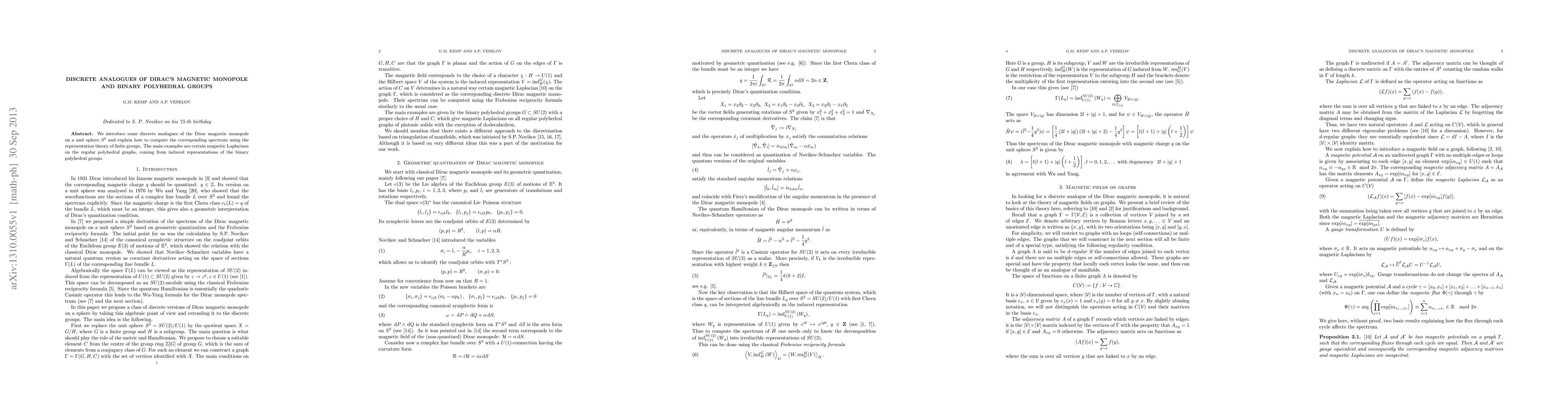 We introduce some discrete analogues of the Dirac magnetic monopole on a unit sphere S^2 and explain how to compute the corresponding spectrum using the representation theory of finite groups. The main examples are certain magnetic Laplacians on the regular polyhedral graphs, coming from induced representations of the binary polyhedral groups.