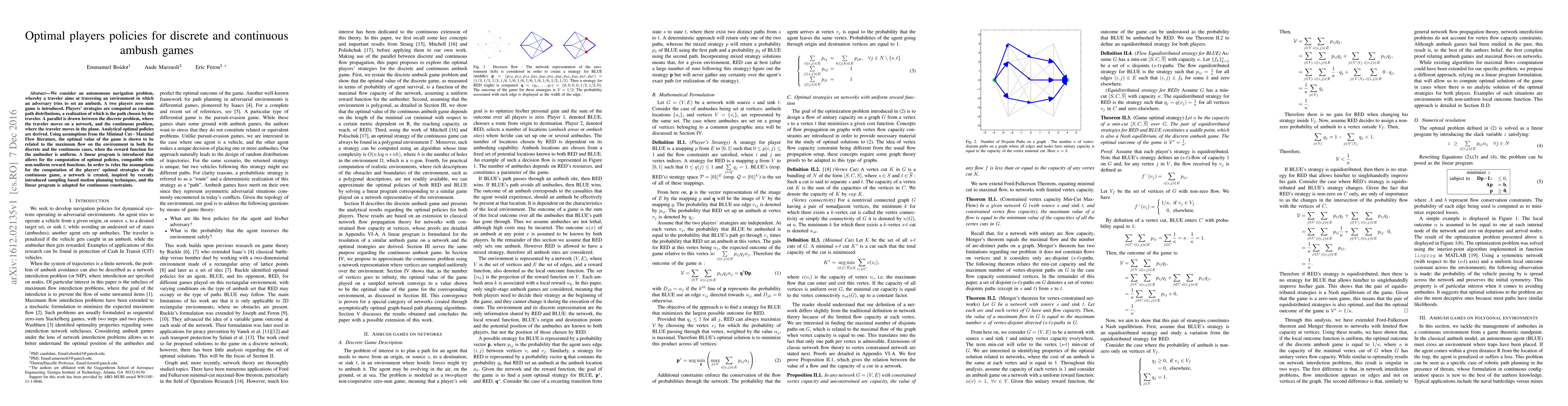 We consider an autonomous navigation problem, whereby a traveler aims at traversing an environment in which an adversary tries to set an ambush. A two players zero sum game is introduced. Players' strategies are computed as random path distributions, a realization of which is the path chosen by the traveler. A parallel is drawn between the discrete problem, where the traveler moves on a network, and the continuous problem, where the traveler moves in the plane. Analytical optimal policies are derived. Using assumptions from the Minimal Cut - Maximal Flow literature, the optimal value of the game is shown to be related to the maximum flow on the environment in both the discrete and the continuous cases, when the reward function for the ambusher is uniform. A linear program is introduced that allows for the computation of optimal policies, compatible with non-uniform reward functions. In order to relax the assumptions for the computation of the players' optimal strategies of the continuous game, a network is created, inspired by recently introduced sampling based motion planning techniques, and the linear program is adapted for continuous constraints.