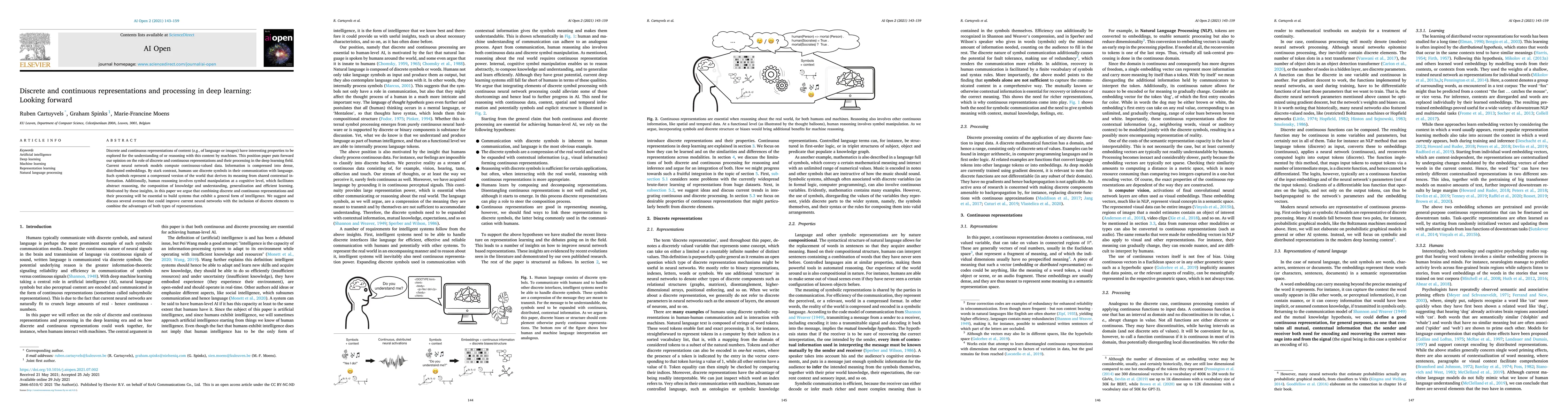 Discrete and continuous representations of content (e.g., of language or images) have interesting properties to be explored for the understanding of or reasoning with this content by machines. This position paper puts forward our opinion on the role of discrete and continuous representations and their processing in the deep learning field. Current neural network models compute continuous-valued data. Information is compressed into dense, distributed embeddings. By stark contrast, humans use discrete symbols in their communication with language. Such symbols represent a compressed version of the world that derives its meaning from shared contextual information. Additionally, human reasoning involves symbol manipulation at a cognitive level, which facilitates abstract reasoning, the composition of knowledge and understanding, generalization and efficient learning. Motivated by these insights, in this paper we argue that combining discrete and continuous representations and their processing will be essential to build systems that exhibit a general form of intelligence. We suggest and discuss several avenues that could improve current neural networks with the inclusion of discrete elements to combine the advantages of both types of representations.