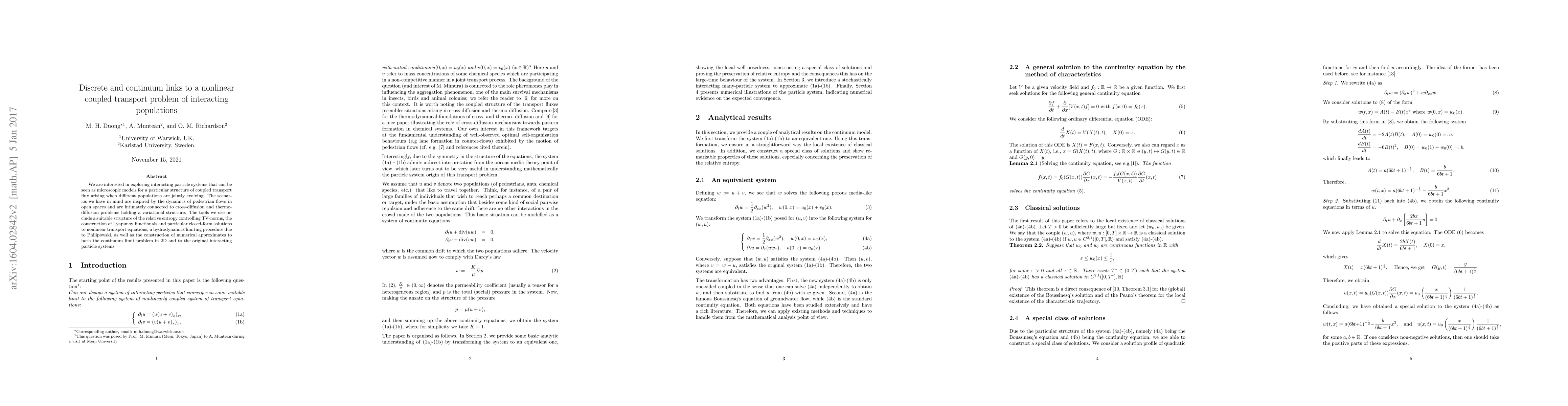 We are interested in exploring interacting particle systems that can be seen as microscopic models for a particular structure of coupled transport flux arising when different populations are jointly evolving. The scenarios we have in mind are inspired by the dynamics of pedestrian flows in open spaces and are intimately connected to cross-diffusion and thermo-diffusion problems holding a variational structure. The tools we use include a suitable structure of the relative entropy controlling TV-norms, the construction of Lyapunov functionals and particular closed-form solutions to nonlinear transport equations, a hydrodynamics limiting procedure due to Philipowski, as well as the construction of numerical approximates to both the continuum limit problem in 2D and to the original interacting particle systems.