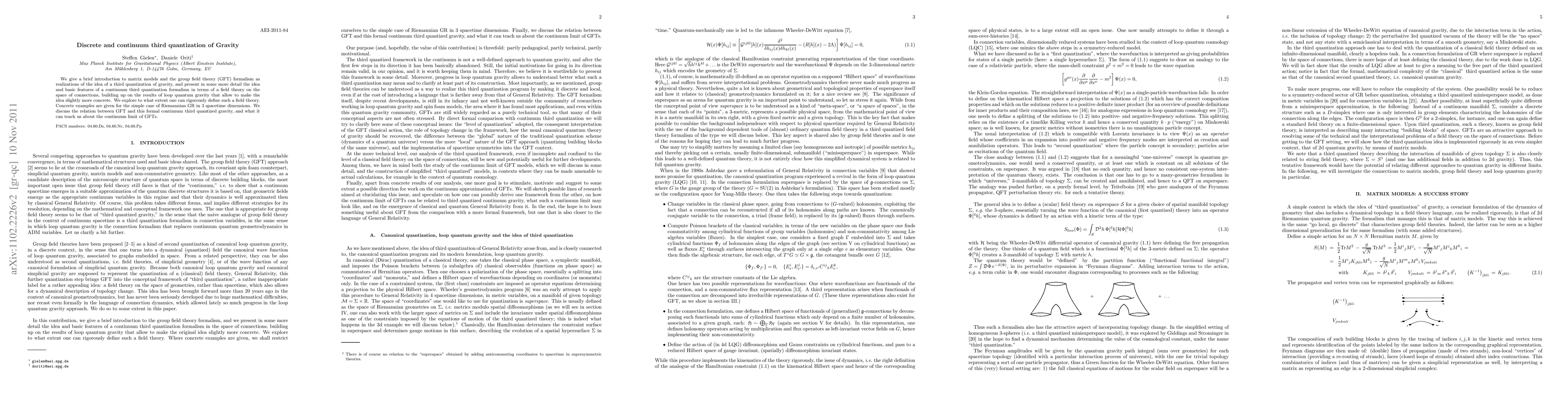 This paper introduces the concept of third quantization in gravity, exploring both discrete matrix models and continuum field theories on the space of connections. It examines the potential for rigorous definitions of such field theories, providing examples in Riemannian GR in 3D, and discusses the connection between group field theory and this continuum approach.