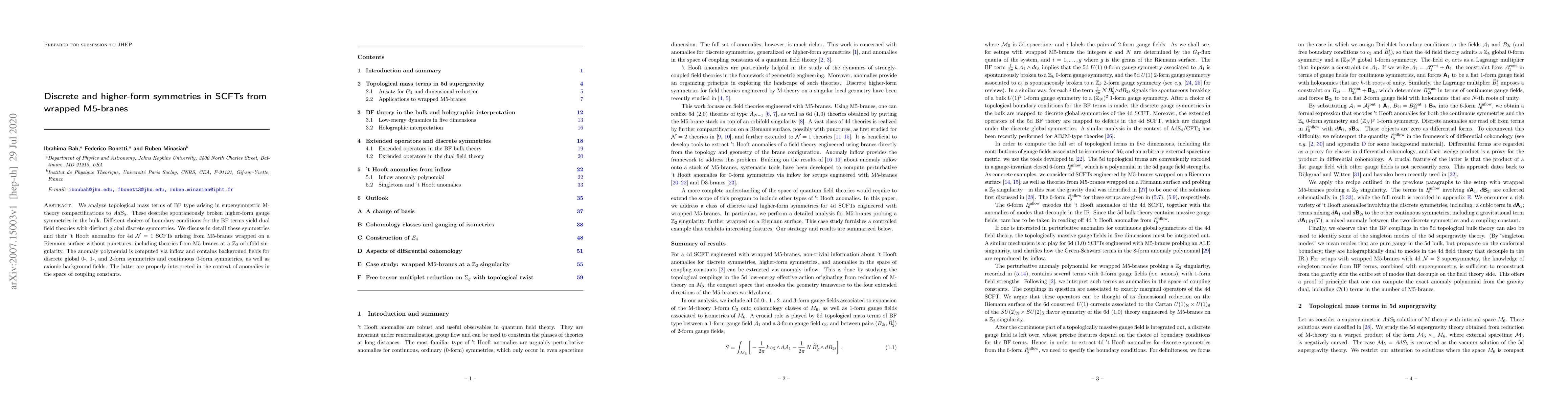 We analyze topological mass terms of BF type arising in supersymmetric M-theory compactifications to $AdS_5$. These describe spontaneously broken higher-form gauge symmetries in the bulk. Different choices of boundary conditions for the BF terms yield dual field theories with distinct global discrete symmetries. We discuss in detail these symmetries and their 't Hooft anomalies for 4d $\mathcal N = 1$ SCFTs arising from M5-branes wrapped on a Riemann surface without punctures, including theories from M5-branes at a $\mathbb Z_2$ orbifold singularity. The anomaly polynomial is computed via inflow and contains background fields for discrete global 0-, 1-, and 2-form symmetries and continuous 0-form symmetries, as well as axionic background fields. The latter are properly interpreted in the context of anomalies in the space of coupling constants.