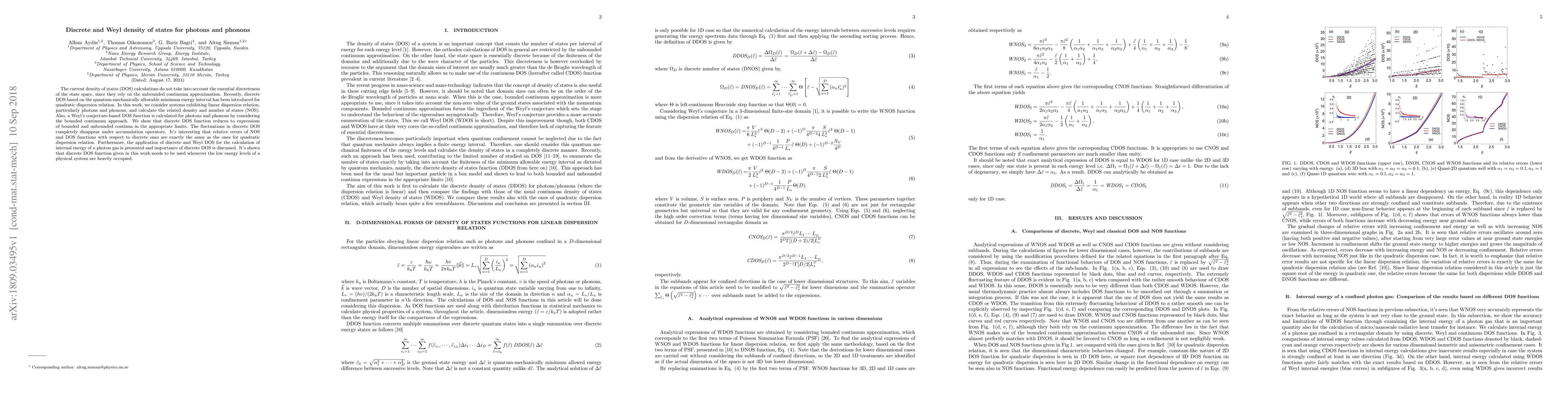 This paper introduces a discrete density of states (DOS) for systems with linear dispersion relations, like photons and phonons, based on quantum-mechanical minimum energy intervals. It compares this with Weyl's continuum-based DOS, showing that discrete DOS reduces to continuum expressions in appropriate limits. The study finds that discrete DOS eliminates fluctuations and provides accurate internal energy calculations for photon gases, advocating its use when low energy levels are heavily occupied.