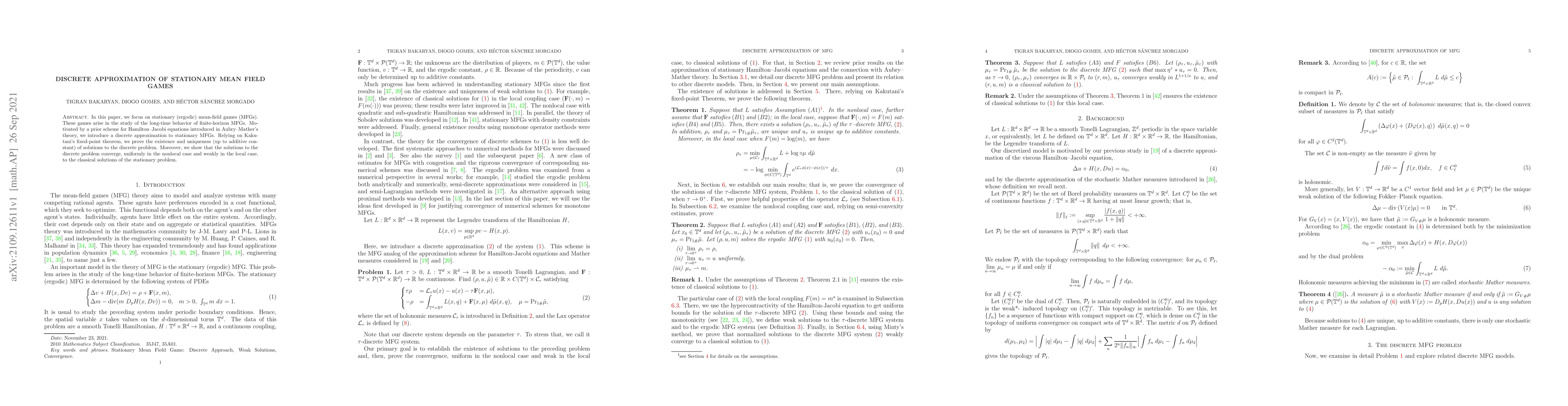 This paper introduces a discrete approximation for stationary mean-field games, proving the existence and uniqueness of solutions to the discrete problem using Kakutani's fixed-point theorem. It also demonstrates the convergence of discrete solutions to classical solutions in both nonlocal and local cases.